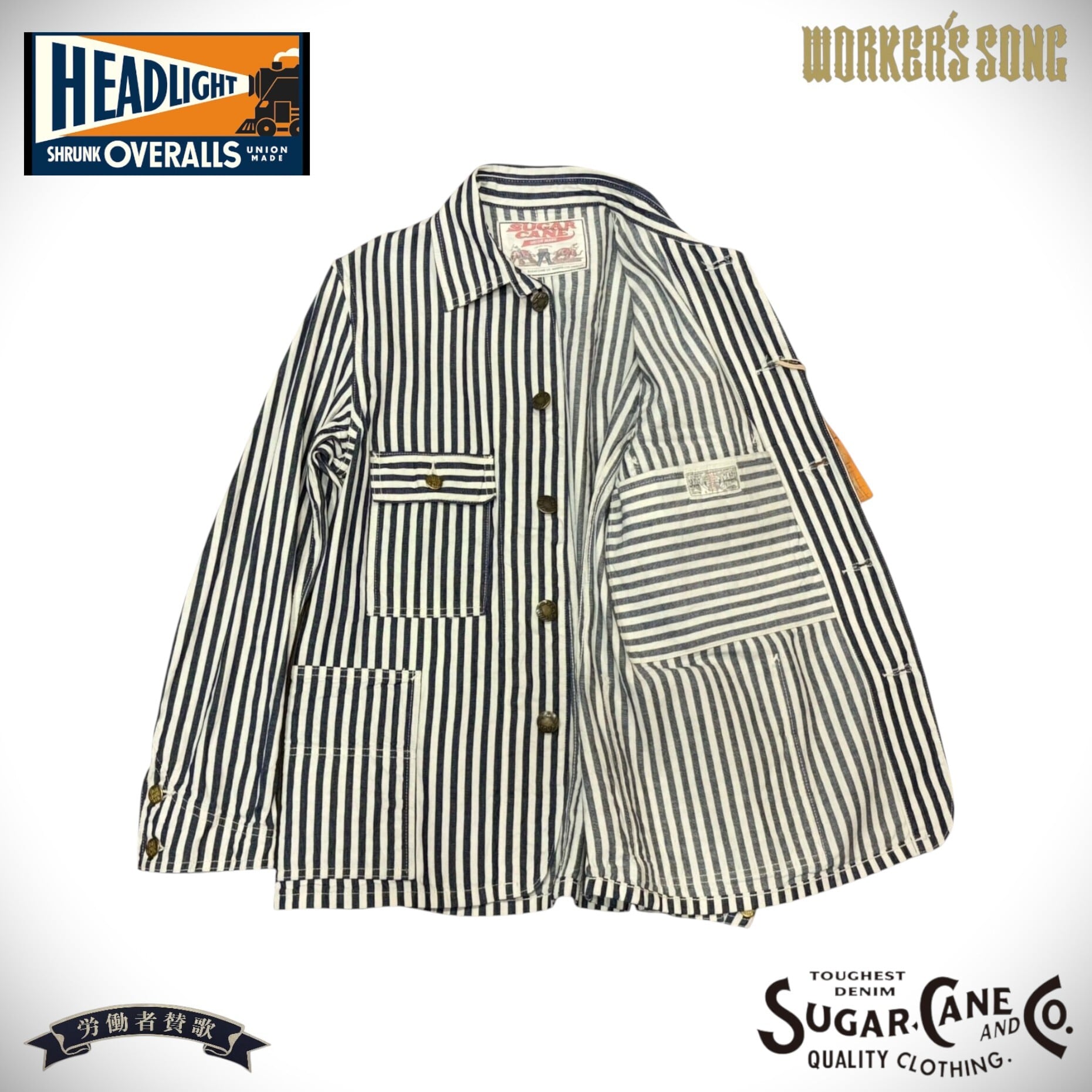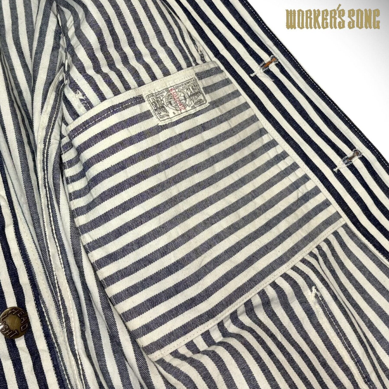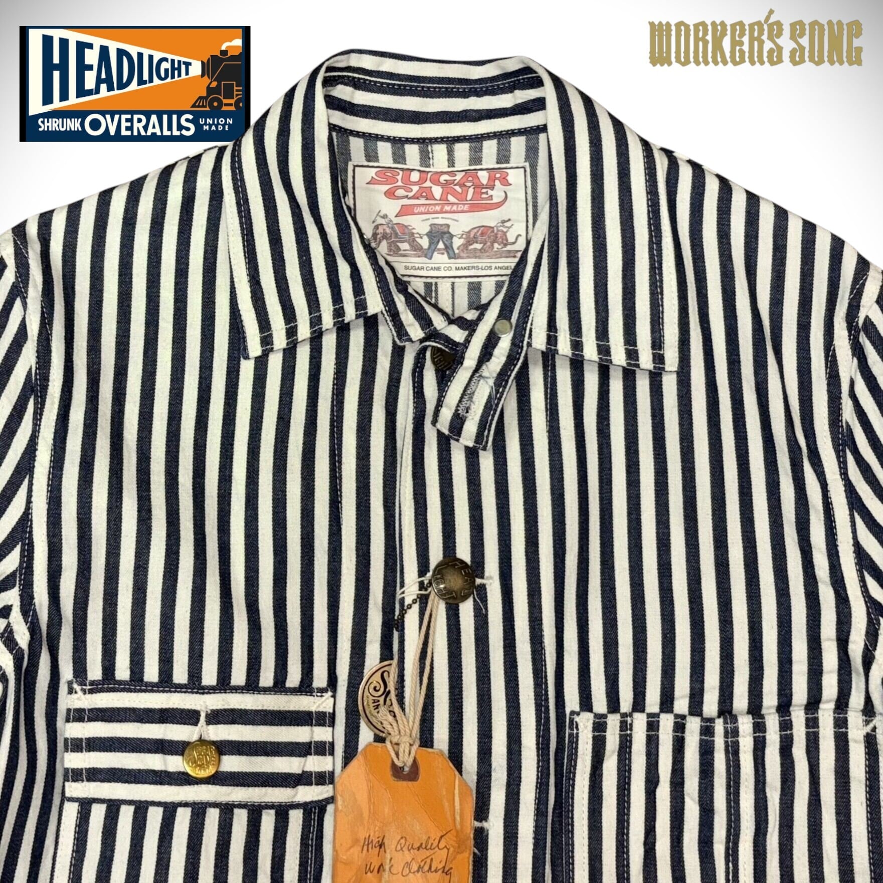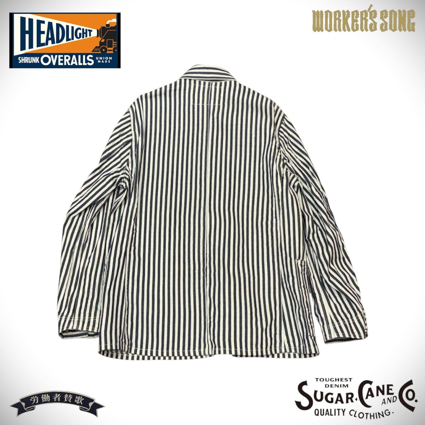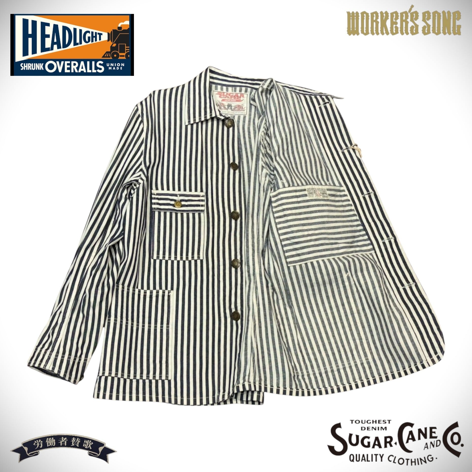 シュガーケーンとヘッドライトのダブルネームで製作されたワークウェア。7オンスの1/2インチ巾や1/4インチ巾のインディゴストライプ生地はNOSで、ミスターフリーダムより入手して日本で縫製している。
