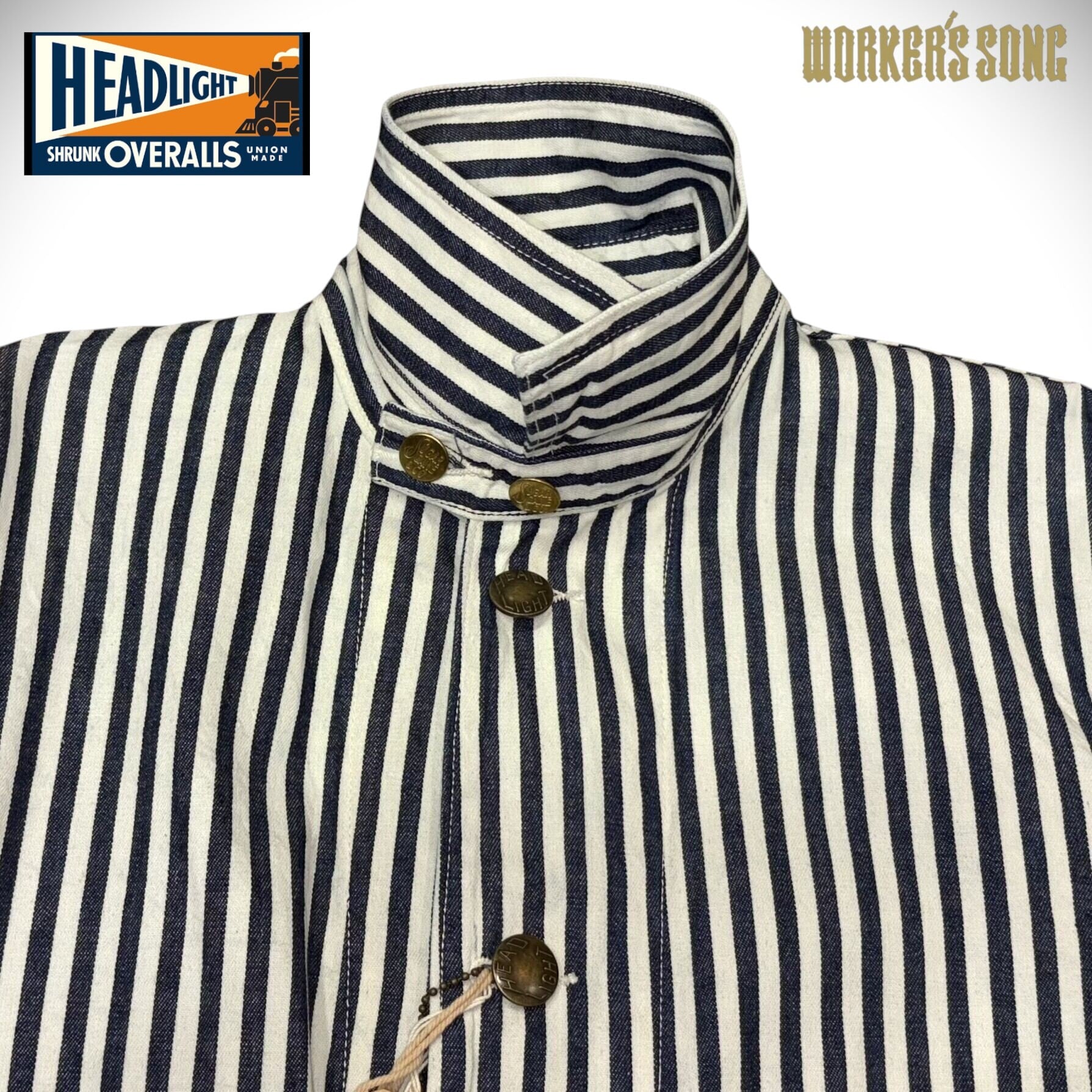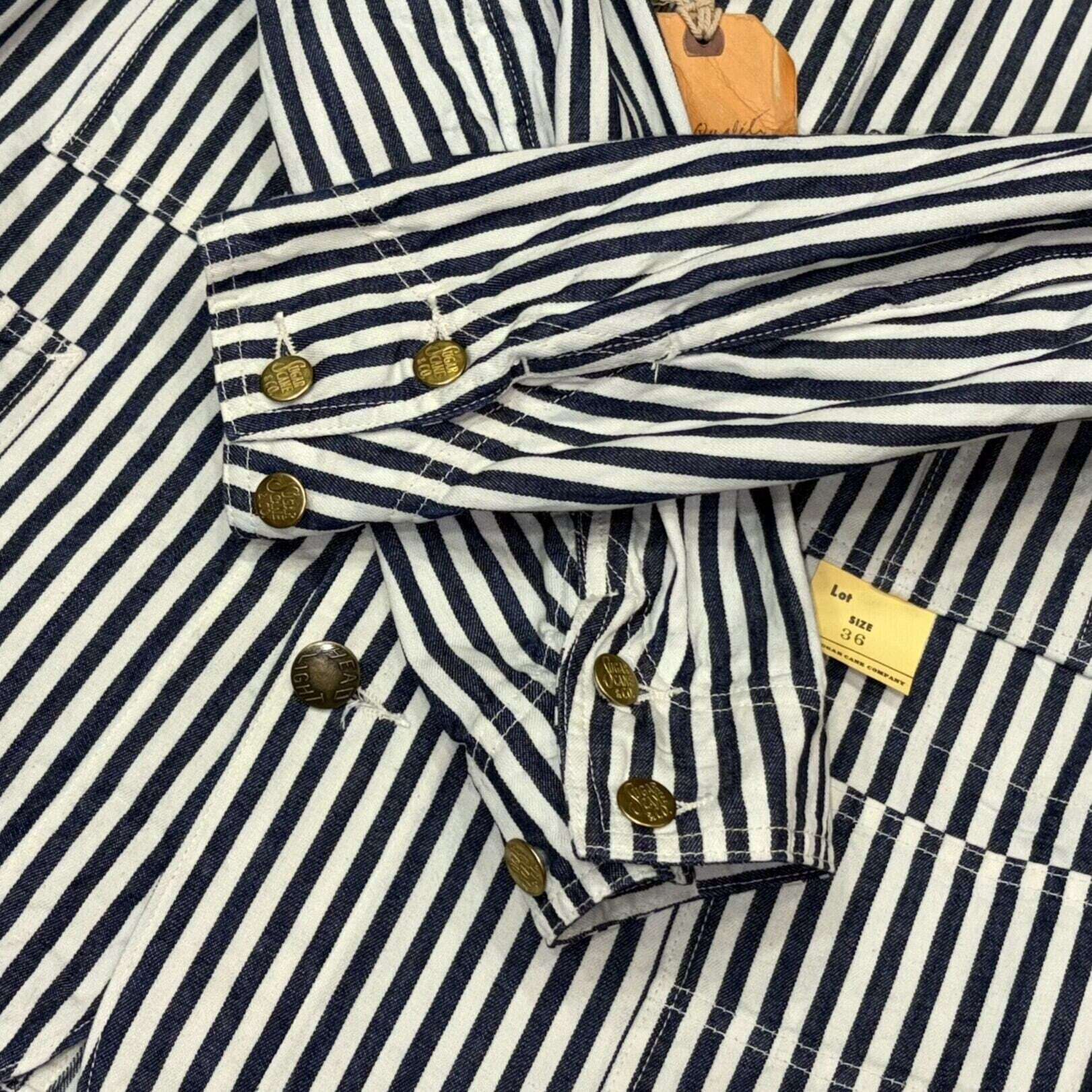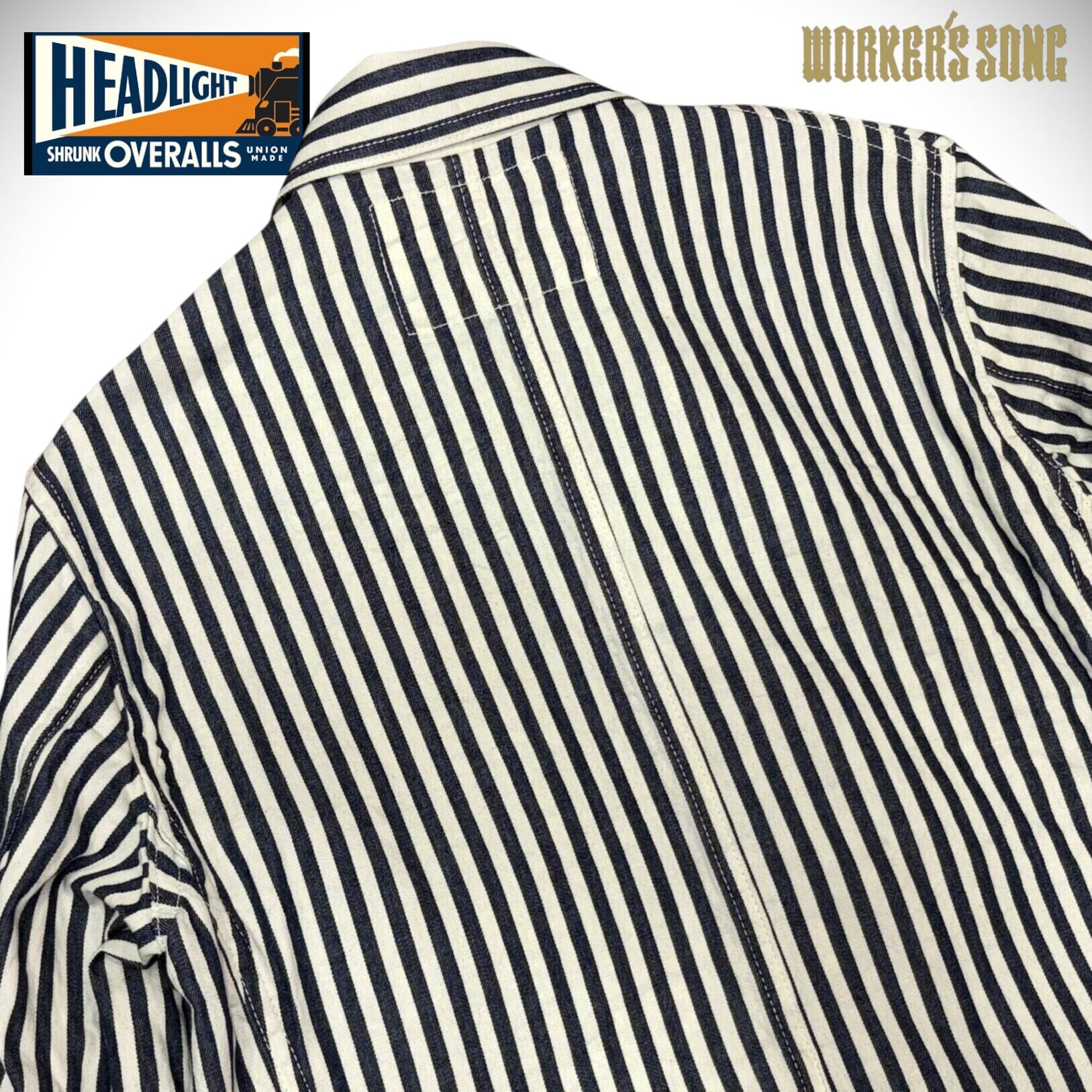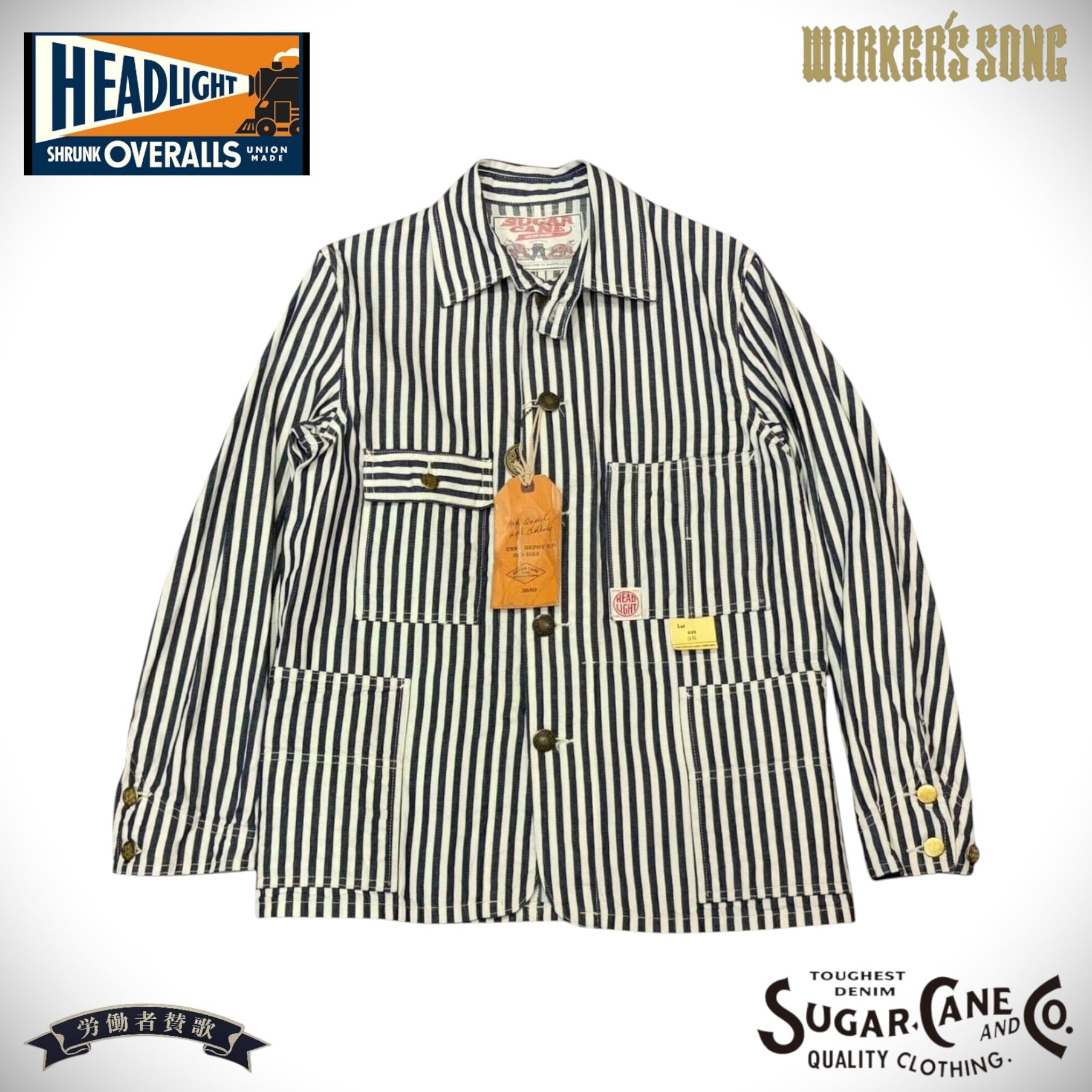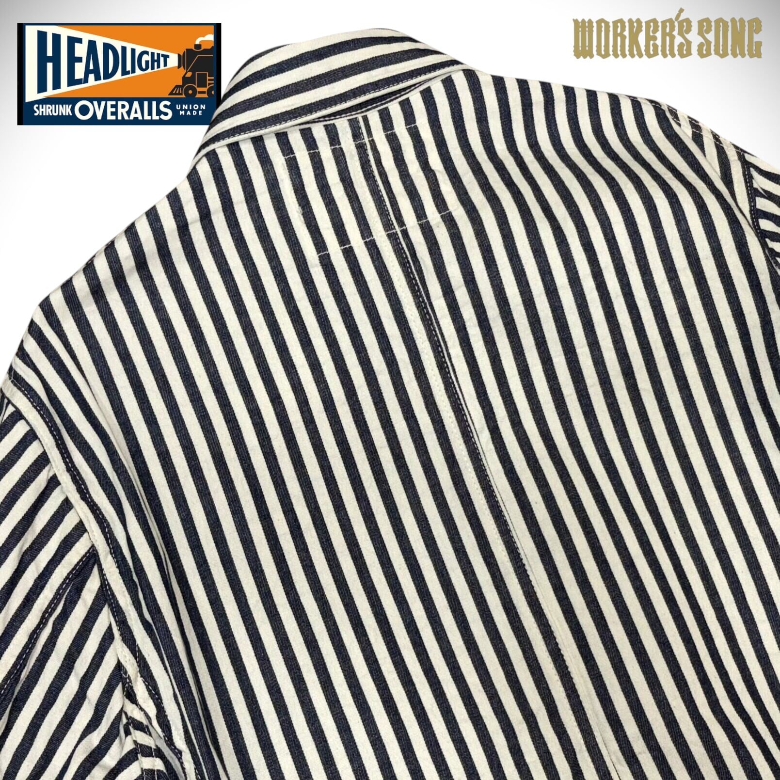 シュガーケーンとヘッドライトのダブルネームで製作されたワークウェア。7オンスの1/2インチ巾や1/4インチ巾のインディゴストライプ生地はNOSで、ミスターフリーダムより入手して日本で縫製している。