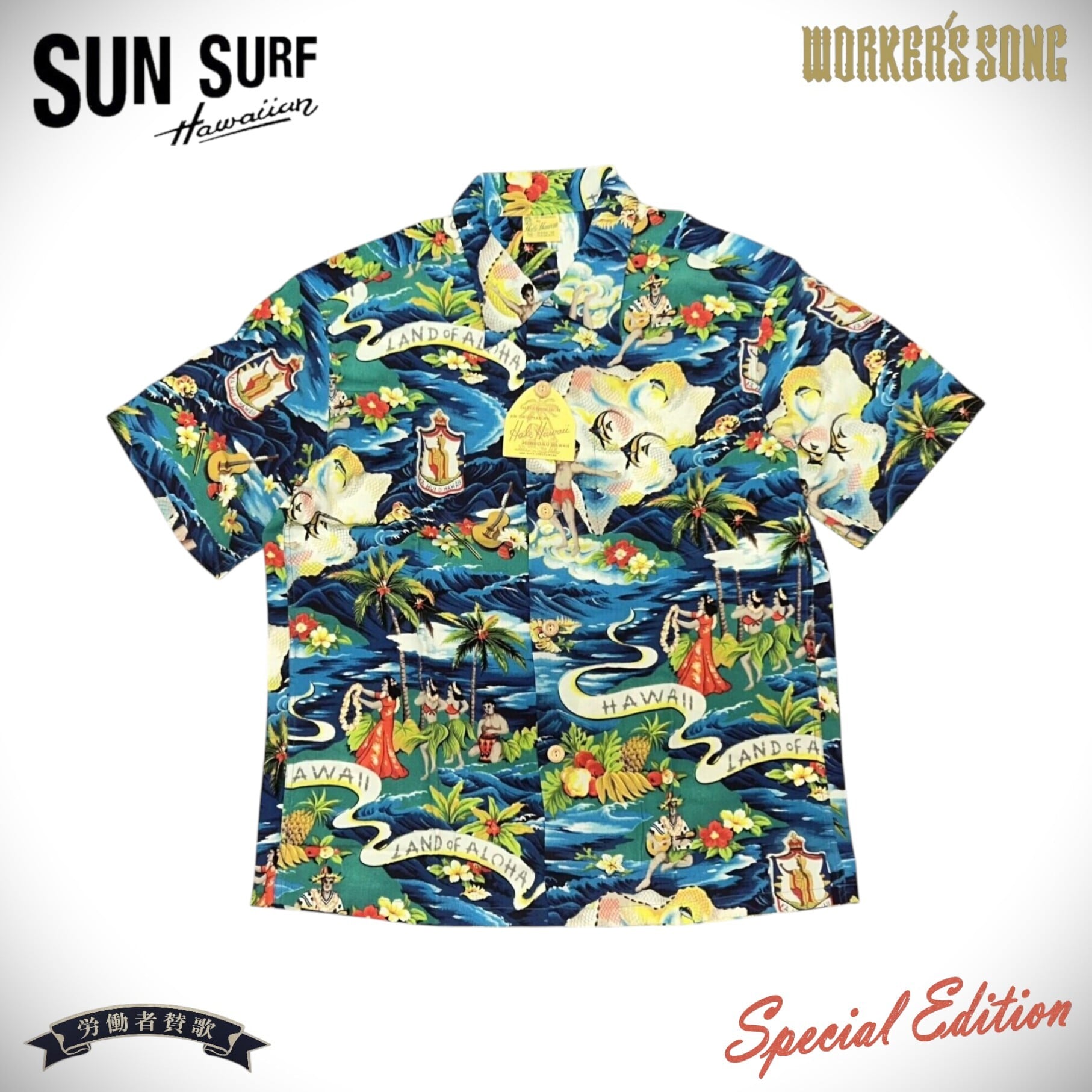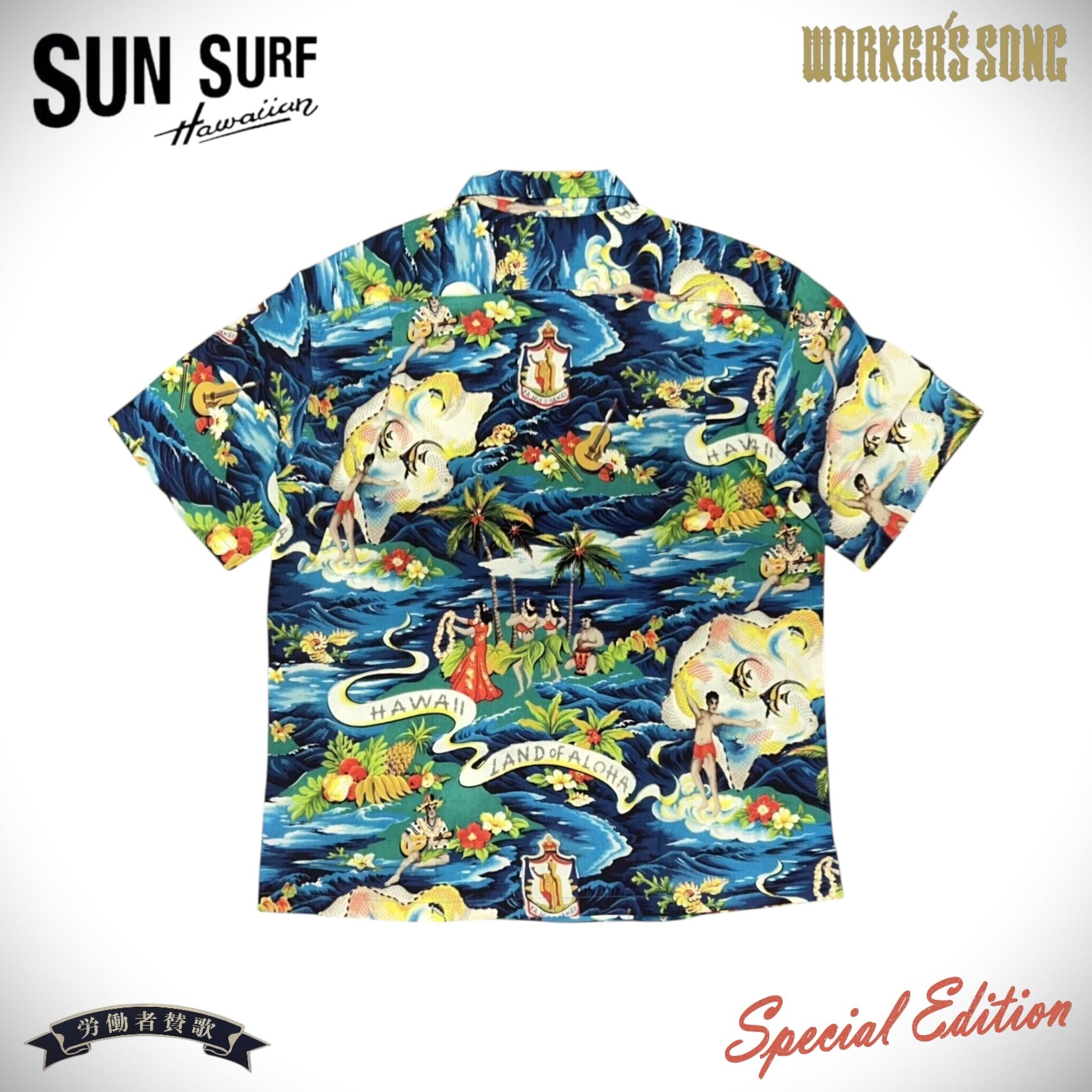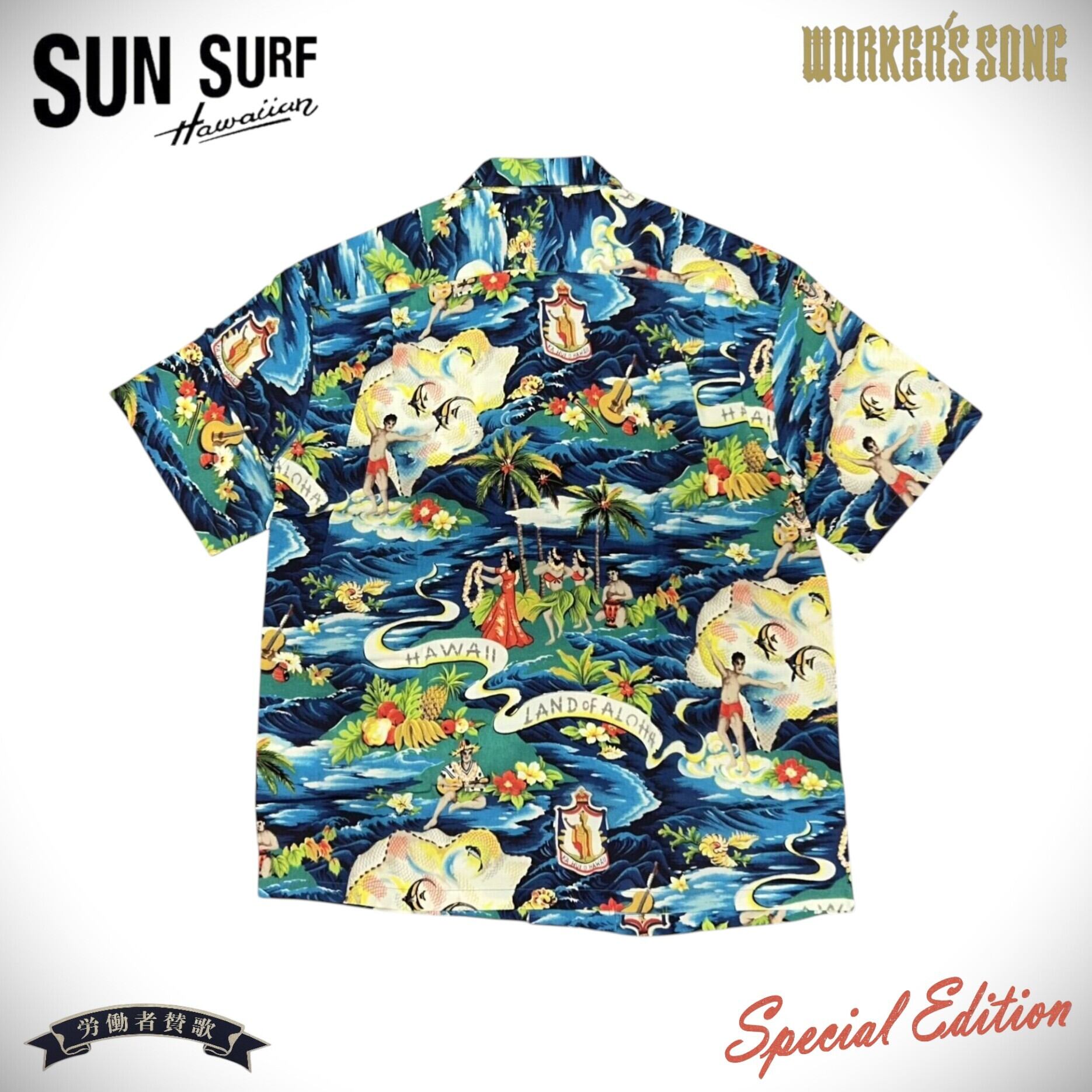 楽園ハワイを象徴するアロハシャツ。その発祥には日系移民が深く関わっており、トロピカルな柄だけでなく和柄もヴィンテージとして存在する。ハワイが観光地として確立した20世紀半ばには、土産物としてのアロハシャツの需要が一気に増加。デザインやパターンが多様化し、多くの作品が生まれた。ヴィンテージのアロハシャツを収集する過程で、ごく稀に出会える特別な逸品。時代の流れとともに失われつつあるそれらの名作を生み出したテキスタイルデザイナーに敬意を表し、多色の贅沢なプリントや迫力のデザイン、メーカーや年代によって異なる各部のディテールまでその魅力を余すところなく完全再現する。それがサンサーフのスペシャルエディション。