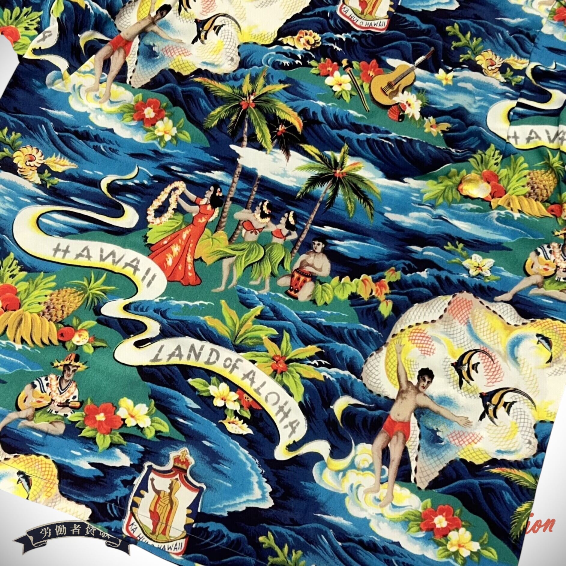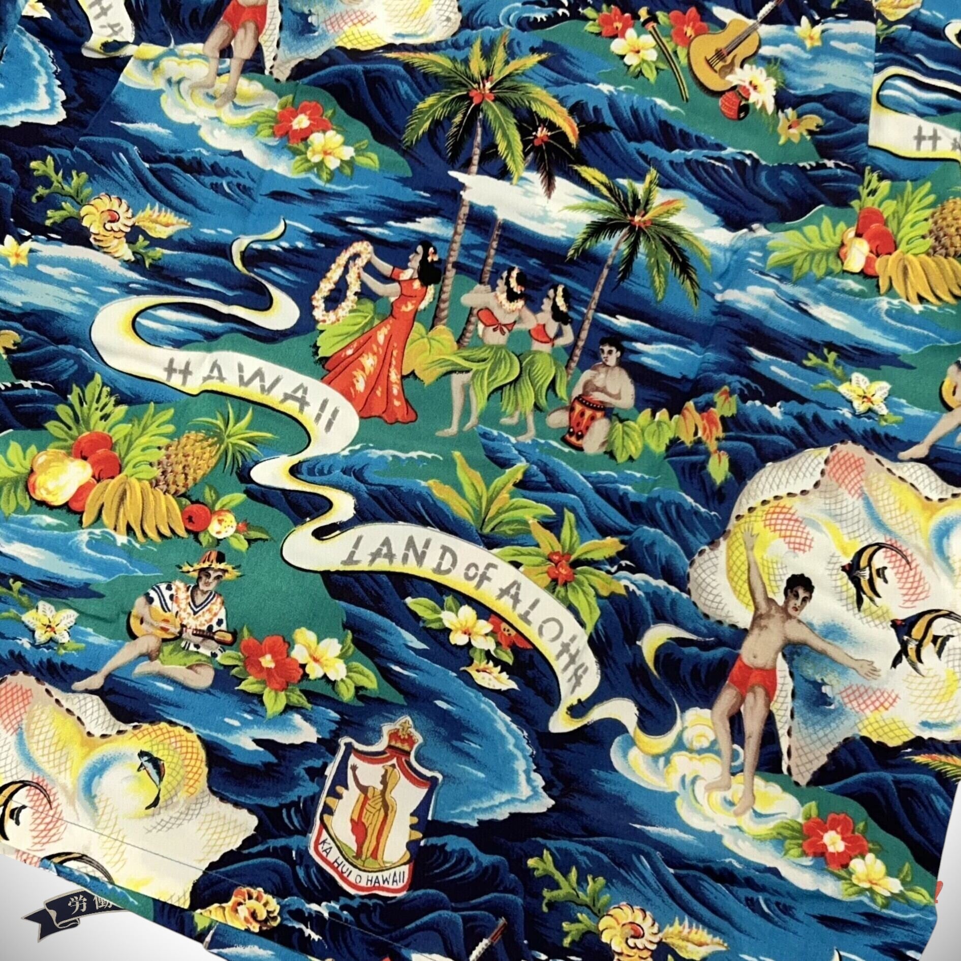 ハワイ観光組合などがスポンサーとなり、20世紀の締めくくりである2000年をアロハシャツイヤーとしてキャンペーンを行った。その際のポスターを飾ったのが、このランド・オブ・アロハ。数あるアロハシャツの中でも最もポピュラーで、アロハシャツらしい作品と判断されたのであろう。21色もの多色でプリントされた生地は当時、京都からハワイへ輸出されたもので、日本の精巧な技術を知ることができる。その緻密で繊細な型合わせと、21色という色数の多さから、再現するために非常に高度な技術を要する柄のひとつ。過去に復刻した経験を活かし、さらなる改良を加え再復刻を果たした。