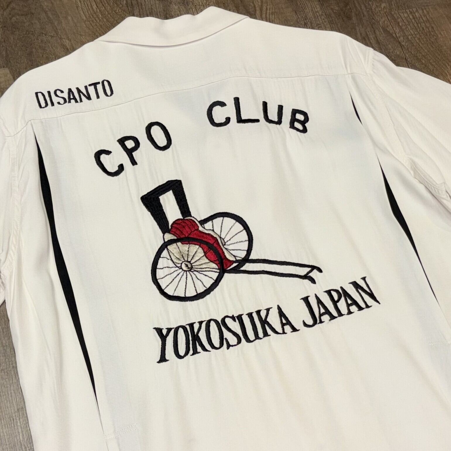 1950年代当時、横須賀米海軍基地に駐留していた下士官 (Chief Petty Officer) 達によるボウリングチームのカスタムオーダー。本作はボウリングシャツでは珍しい人力車が描かれ、米兵達はそのオリエンタルな佇まいを興味深く眺めていたことが想像できる。ヴィンテージは横須賀ドブ板通りにあるショップでオーダーされた。