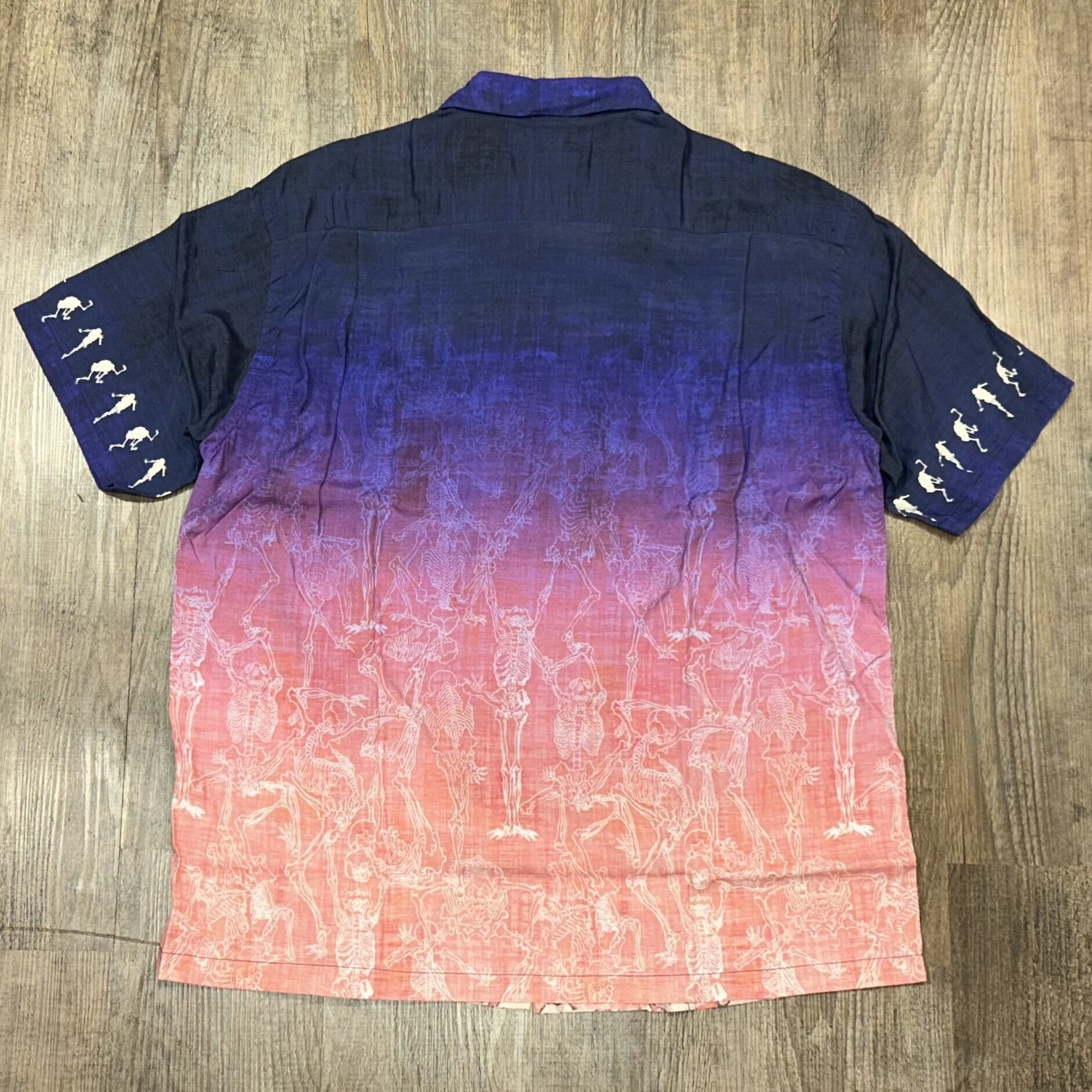 この「暁斎漫画」に描かれているのは骸骨だが、そのような人々の骨格の動きが生き生きと描かれている。サンサーフでは、それらの並びを分解・再構築して躍動感を表現。袖と襟元にもアクセントとして柄を入れ、1950~60年代のアロハシャツにみられる仕様を取り入れた。