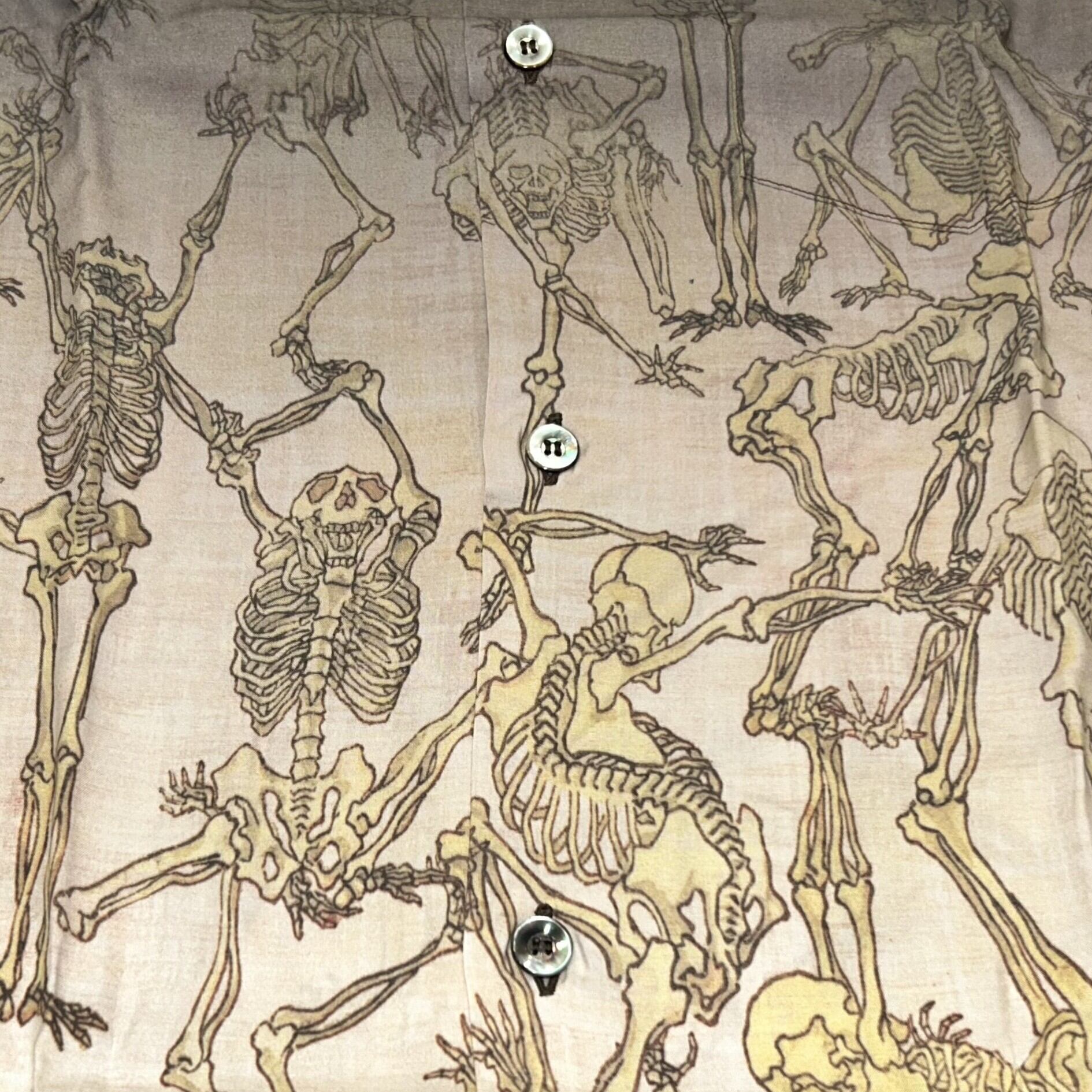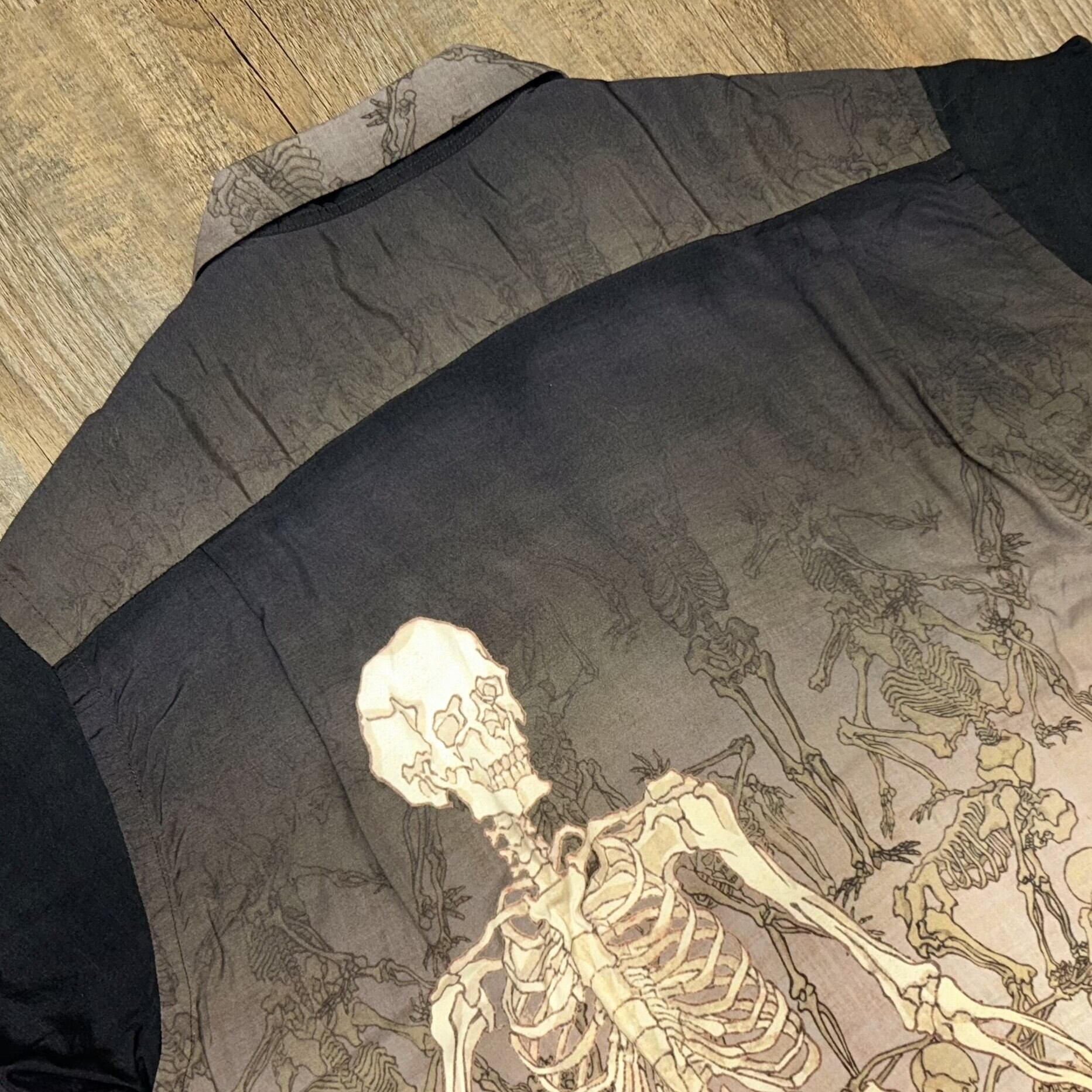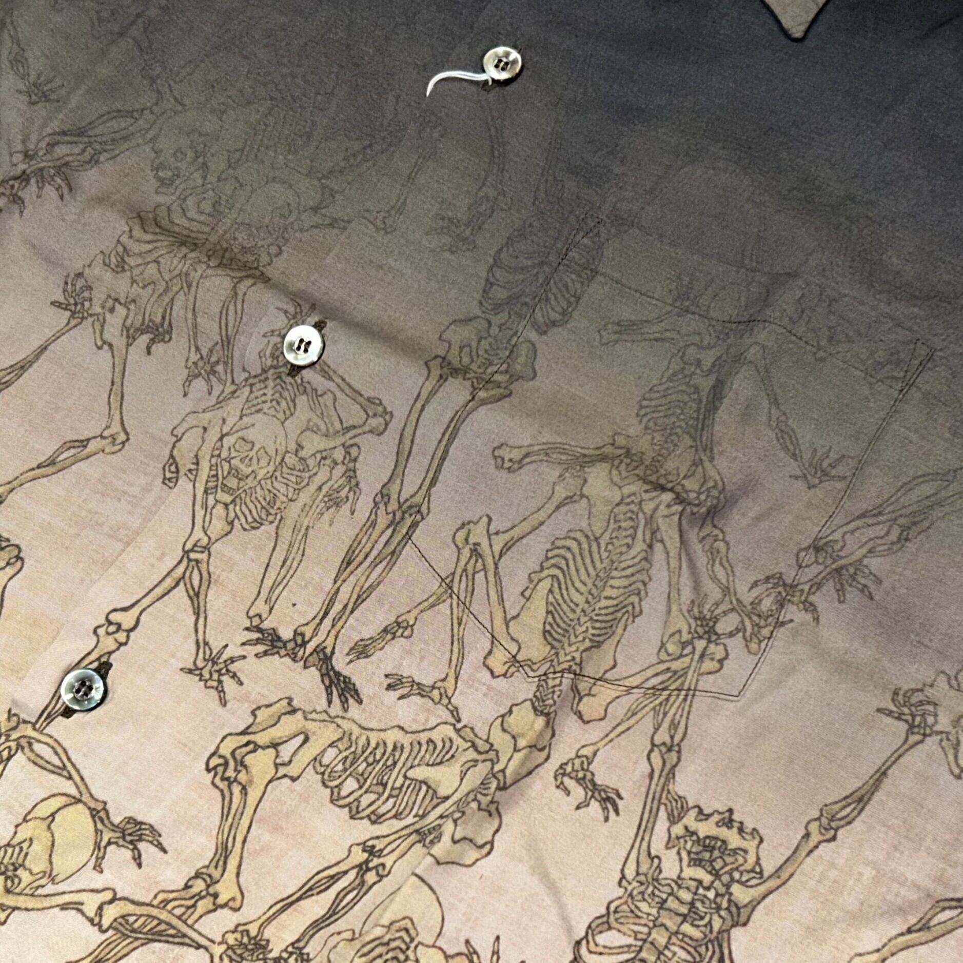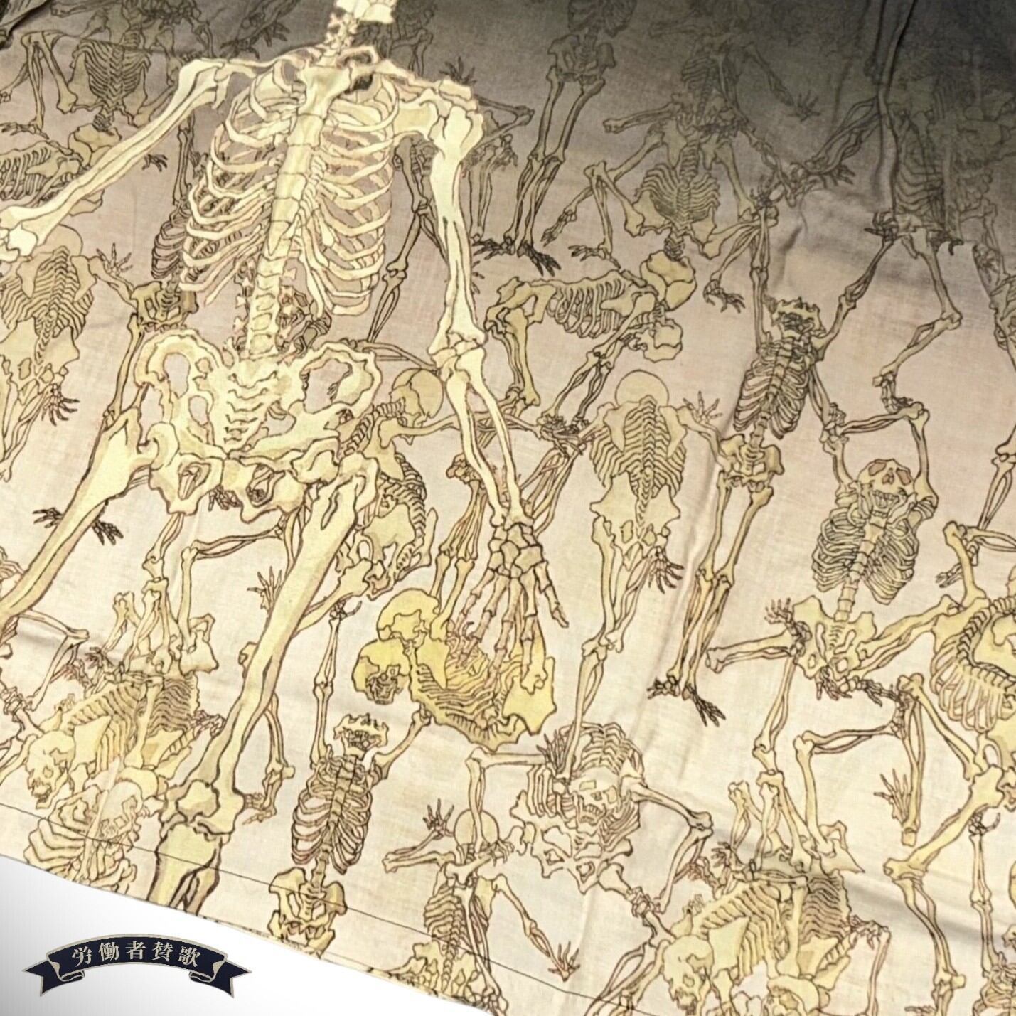 こちらのデザインではブラックを基調とし、全体的に落ち着いた色のグラデーションを駆使して「暁斎漫画」をプリント。暗闇から骸骨が浮かび上がる様をアロハシャツに表現した。様々なポーズをとり、躍動感あふれるタッチで描かれた骸骨たちが立ち並ぶ情景は、見る者に強烈な印象を残す。