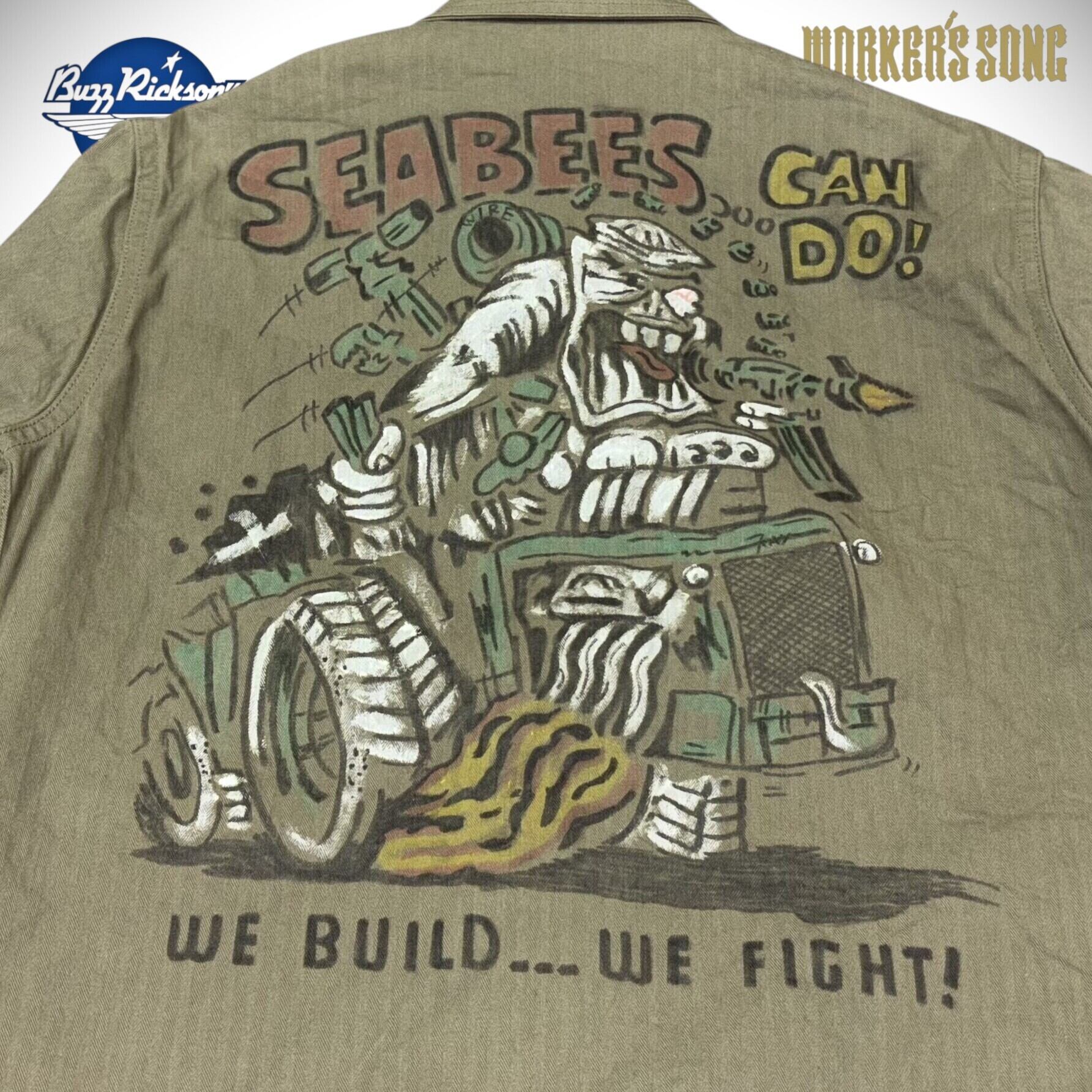 米海軍が1940年代初頭に採用したN-3ユーティリティージャケット。ボタンは大戦期に使用された黒塗りのドーナツ型タックボタンで月桂樹の刻印が施されている。袖は筒状の1枚袖で、袖先に打ち込まれた2つのタックボタンで調節が可能。背面にはホットロッド界の巨匠、エド・ロス風のタッチでSEABEESの隊員がジープで疾駆する様が大迫力で描かれている。