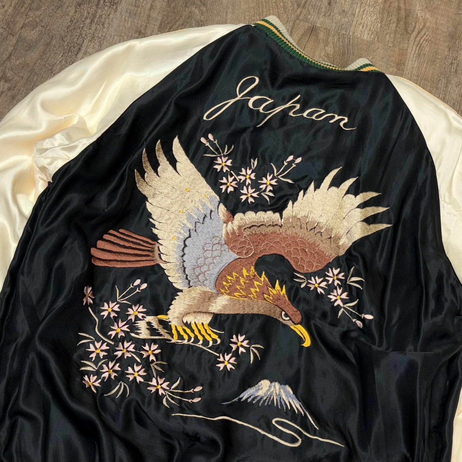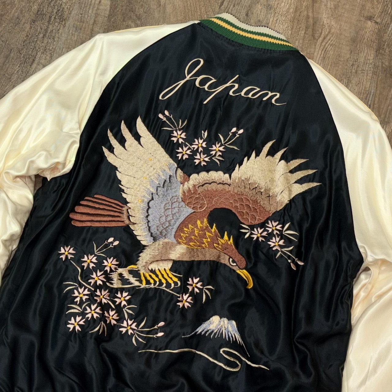 リバーシブル面は咲き誇る桜の中で翼を広げる鷲の図案。ヴィンテージスカジャンにおいて桜は鷲とともに描かれることが多いが、本作は桜を細かく、数多く描写しているのが特徴。ブラックのアセテートに淡い色の桜が際立ち、当時の米兵の心をくすぐる日本の美学が表現されている。
