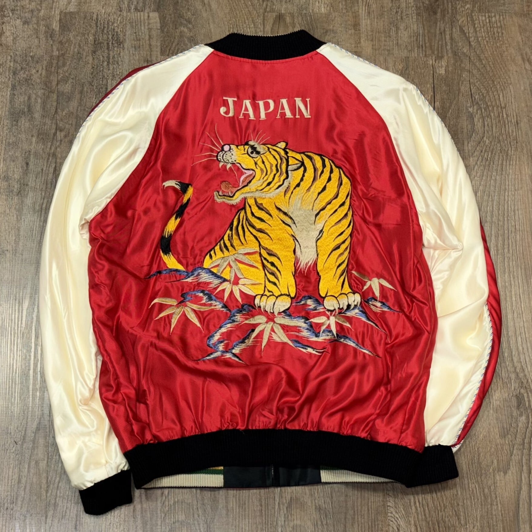 表面は真紅のアセテートに鎮座する味わい深い表情の虎を描いた1950年代前期の作品。程よくデフォルメされた虎の刺繍は他のヴィンテージスカジャンの刺繍に比べて一回り大きく、インパクトのある仕上がりとなっている。特徴的な書体の「JAPAN」の文字や、レッド×オフホワイトのボディにブラック単色のリブを組み合わせているのもレアなポイント。