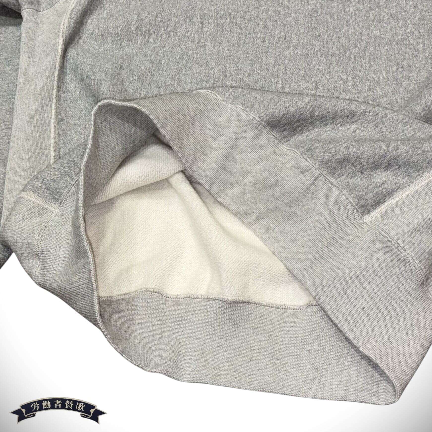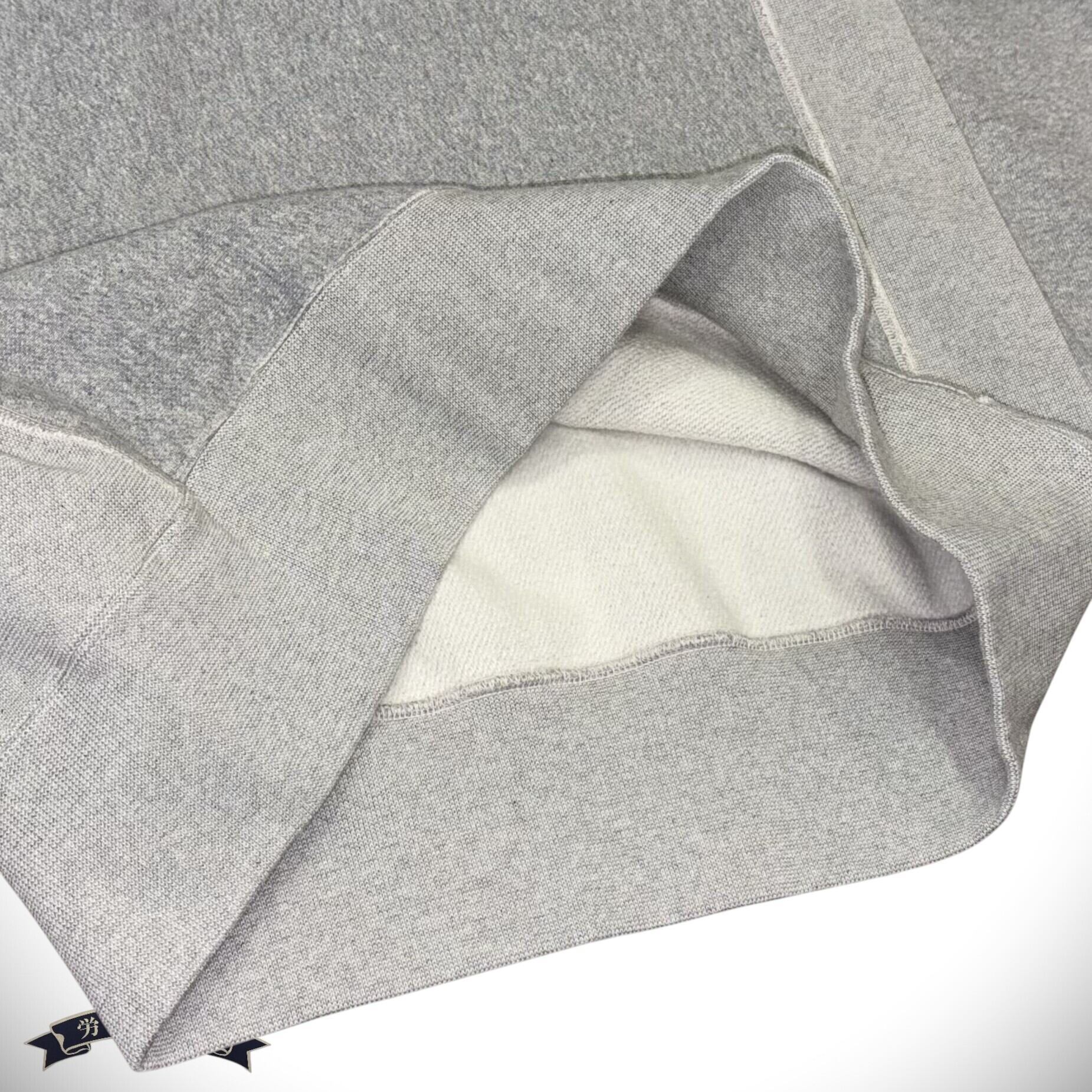 ヘビーウェイトのホリゾンタル・ニッティング。ホリゾンタルとは「横方向」という意味で、丈の縮みを防止すると共に脇に縦方向のパネルを使い、縦横の伸縮性を意識した仕様。継ぎ目がない肩は着用している時にストレスが掛かることなくスムースな着心地を誇るが、裁断時において広い面積でカットし、ネック部分をくり抜くなど大掛かりな作業が必要となる。