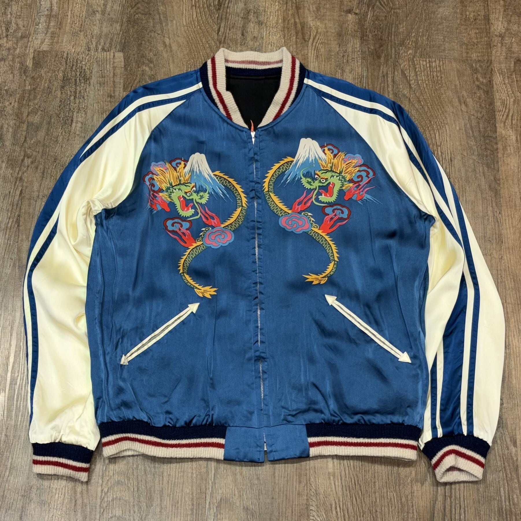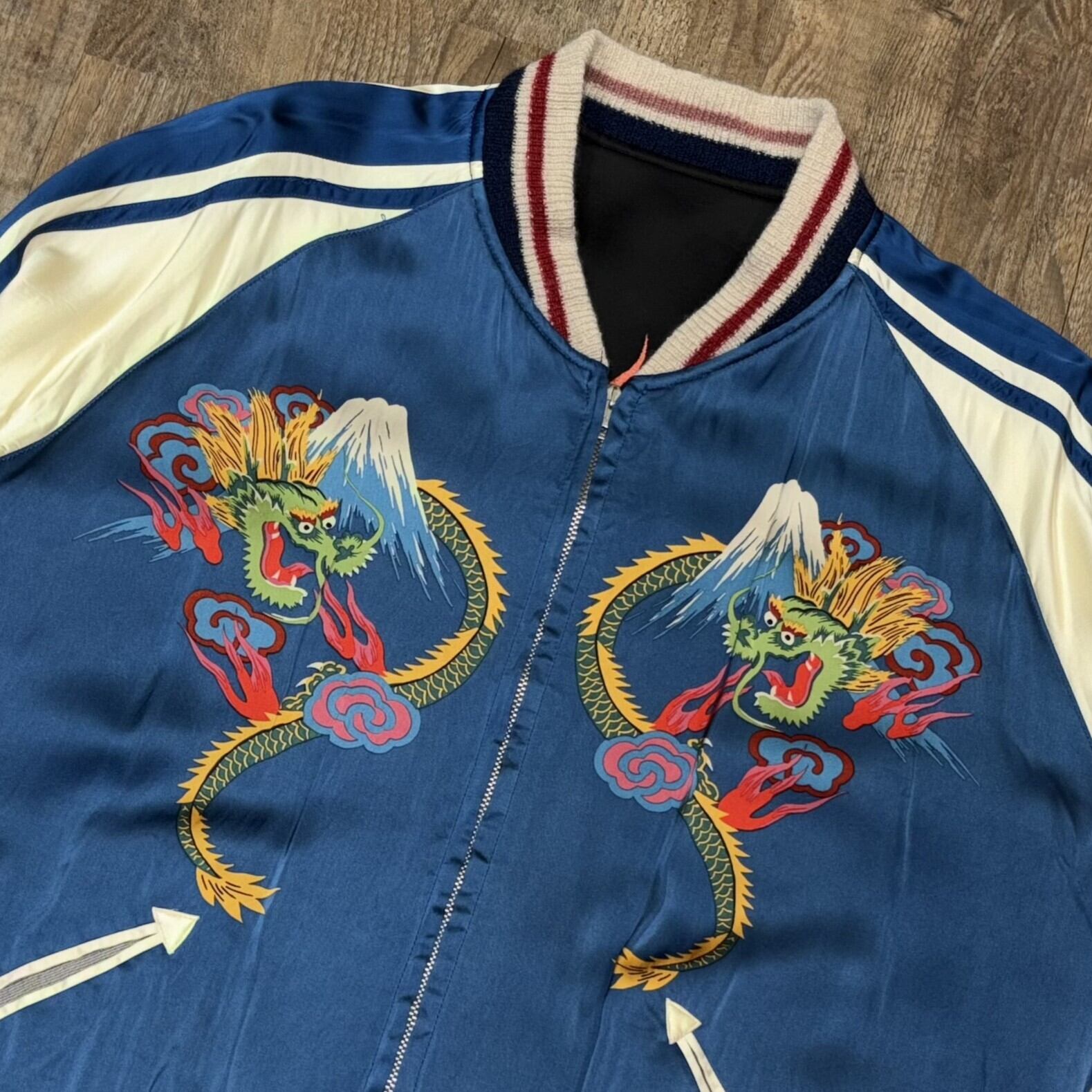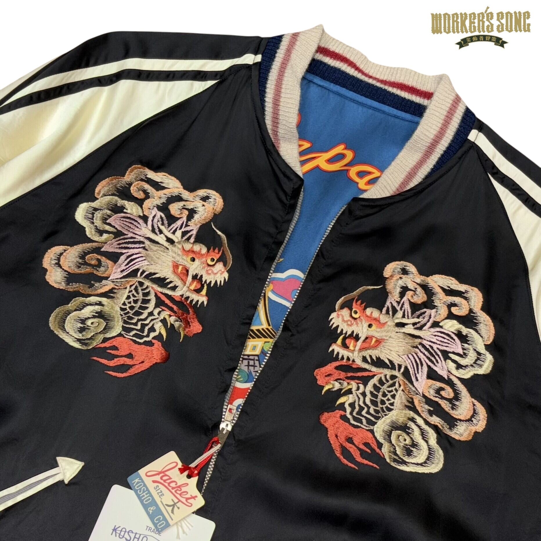 リバーシブル面は、近代的な機械によるプリントではなく、一色ずつプリントの版を作り、それらを手作業で刷り重ねる手捺染(ハンドプリント)によるもので、想像を絶する手間と時間を要する。それゆえ当時の生産数もごくわずかで現存数が非常に少なく、ヴィンテージ市場では耳を疑う金額で取引される代物。本作は両面とも希少な絵柄の組み合わせとなっており、スカジャンの生みの親である「港商」の名に相応しい逸品といえよう。