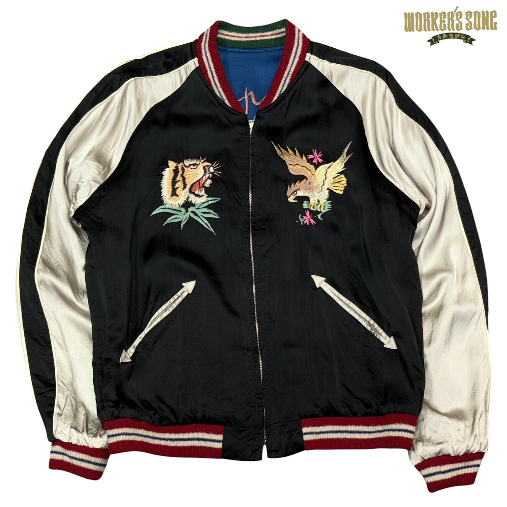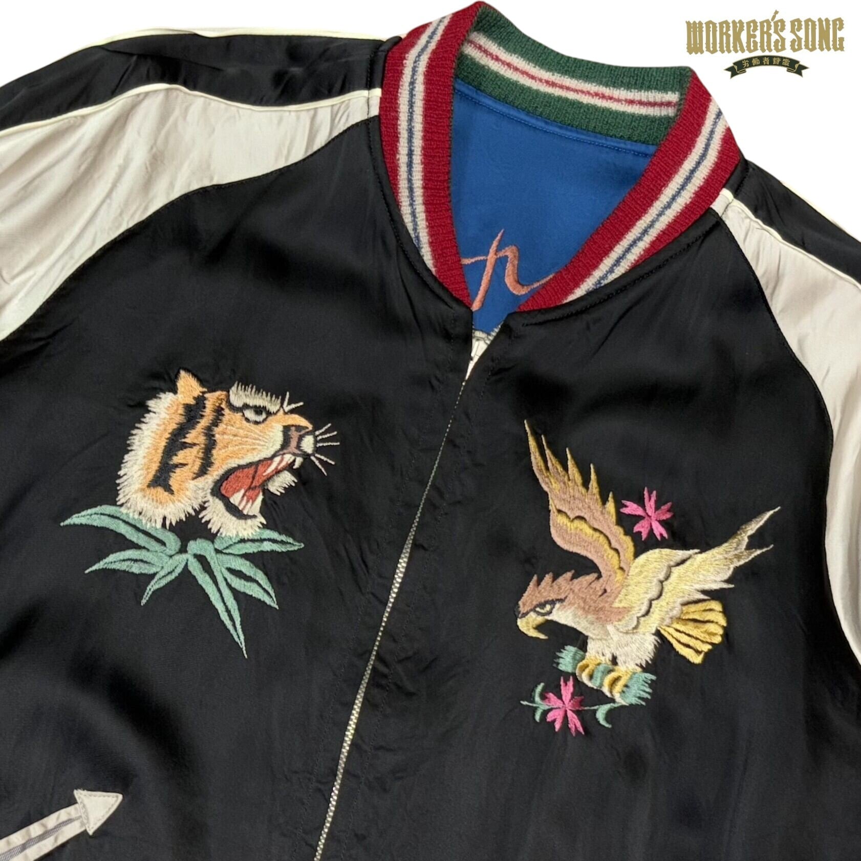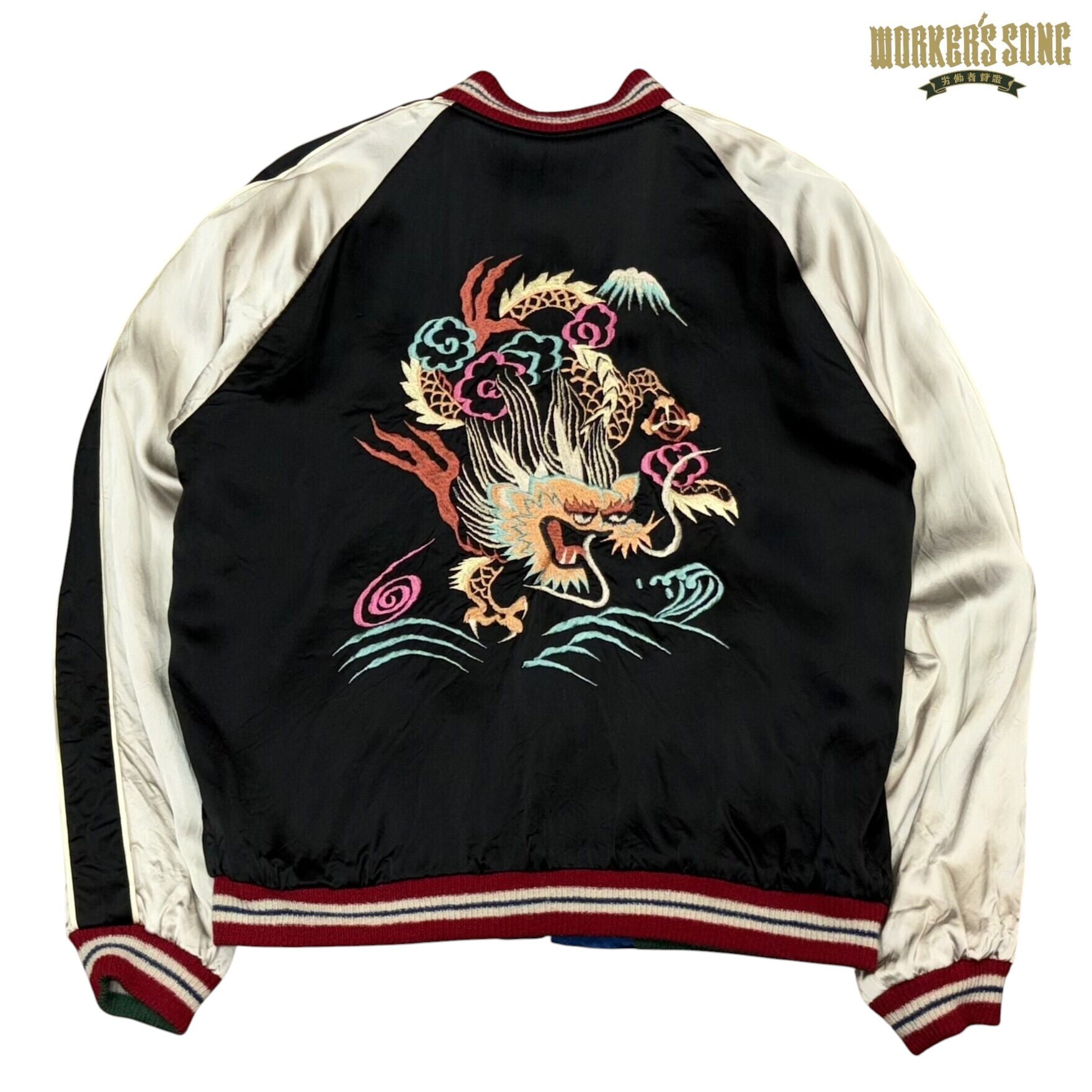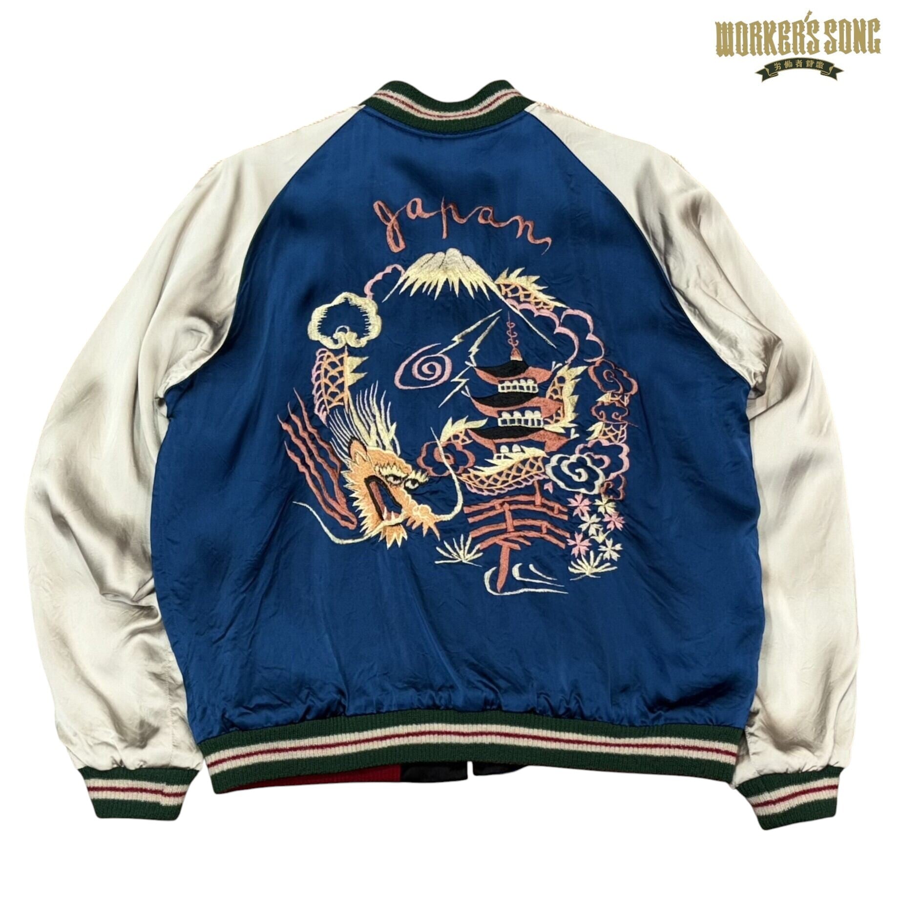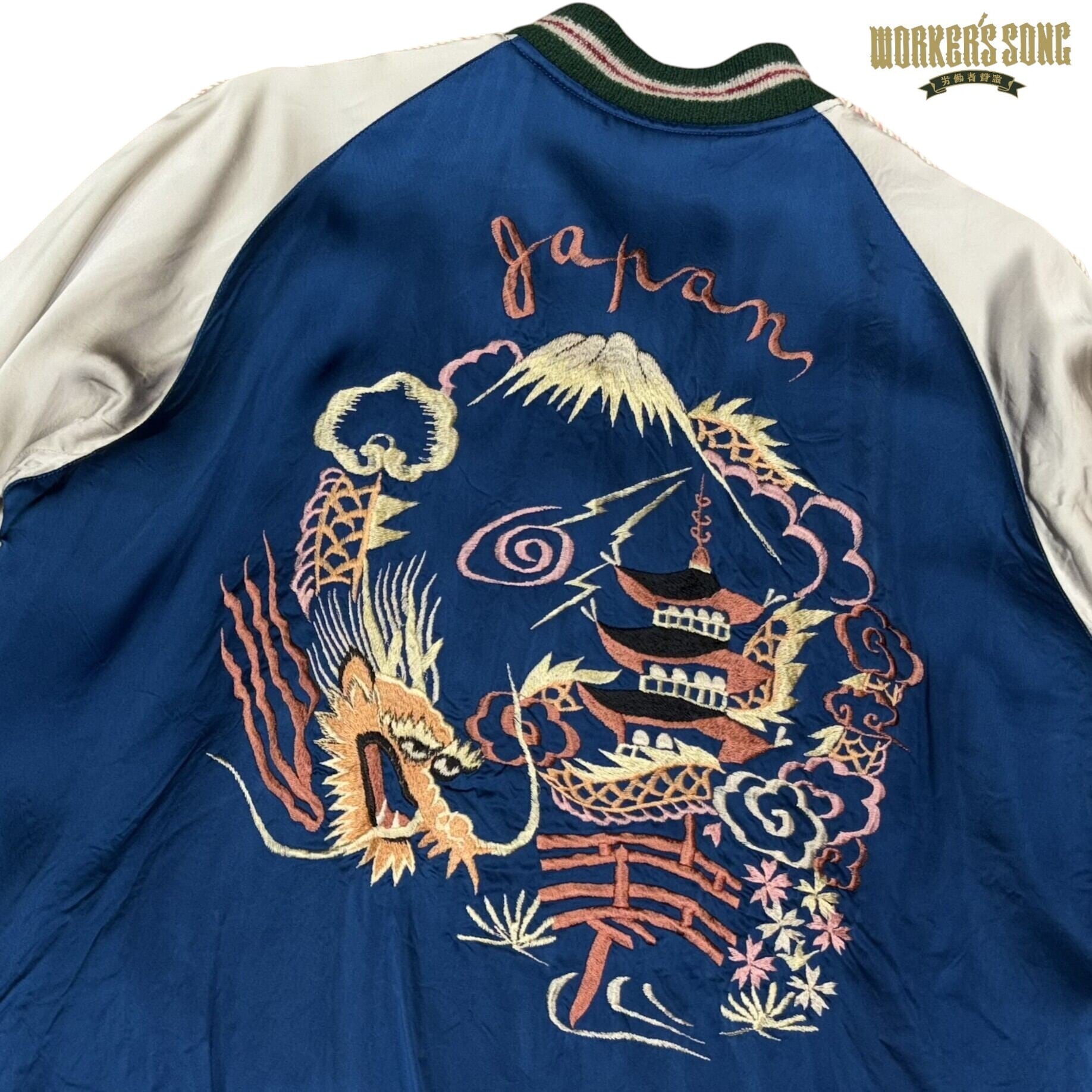 表面はブルーのアセテート生地が晴天を想わせる日本の風景と龍を組み合わせた絵柄。ボディの配色とは対照的なグリーンに赤いラインのリブもヴィンテージの魅力溢れる作り。