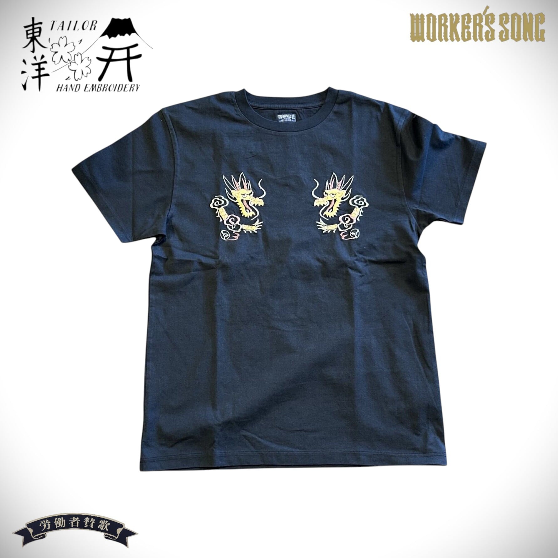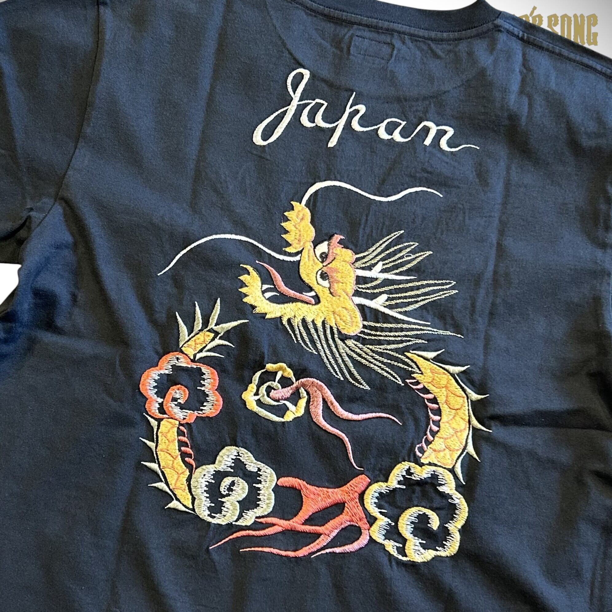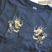 1950年代中期のスカジャンにみられる龍の絵柄を描いたTシャツ。どこか愛嬌ある龍が円を描き上空へ舞い上がる構図は独特の存在感を放ち、シンプルなボディに豪華な刺繍がマッチしている。夏場でも気軽にスカジャンの雰囲気を味わえるTシャツに仕上がった。
