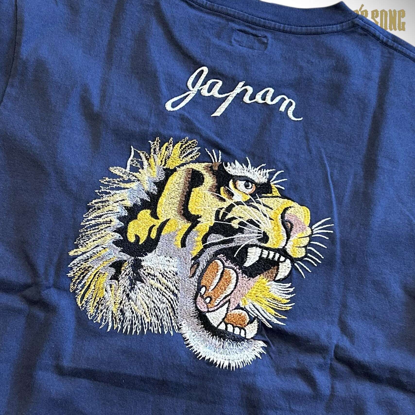 迫力ある虎の顔を細部まで緻密に表現した通称「タイガーヘッド」と呼ばれる人気の絵柄。鬣(たてがみ)は何度も針足を変えながら一本一本繊細に描かれ、Tシャツとはいえ一切妥協をせずに刺繍を施している。フロントのややデフォルメされたタッチの虎との対比も魅力。