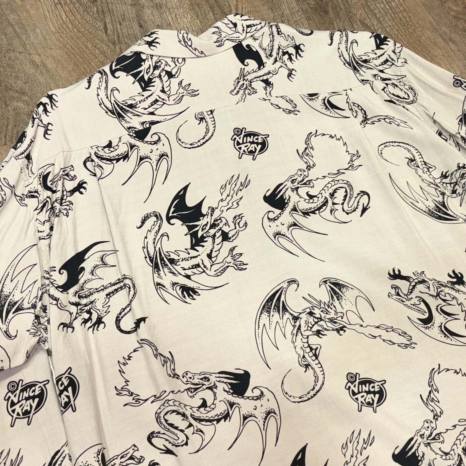 スターオブハリウッドのためにヴィンス・レイが描き下ろした限定のデザイン。オリエンタルな龍ではなく、翼を持ち口から炎を放つ西洋のドラゴンが5体、シャツ全体を飛び回るように生き生きと描かれている。