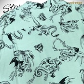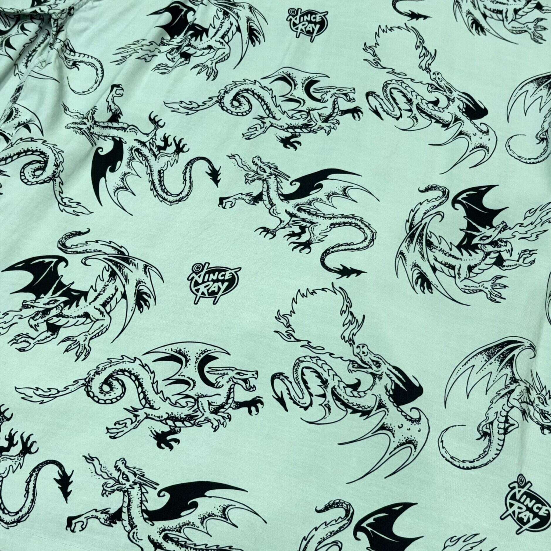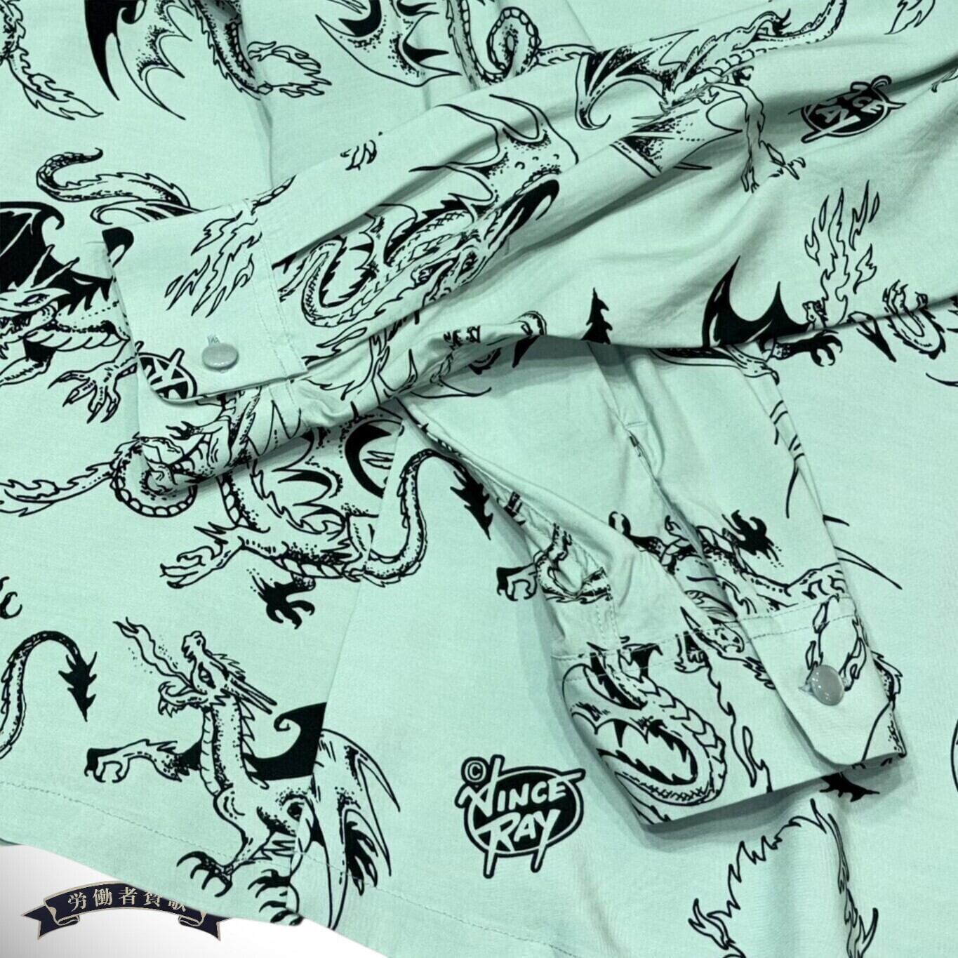 スターオブハリウッドのためにヴィンス・レイが描き下ろした限定のデザイン。オリエンタルな龍ではなく、翼を持ち口から炎を放つ西洋のドラゴンが5体、シャツ全体を飛び回るように生き生きと描かれている。