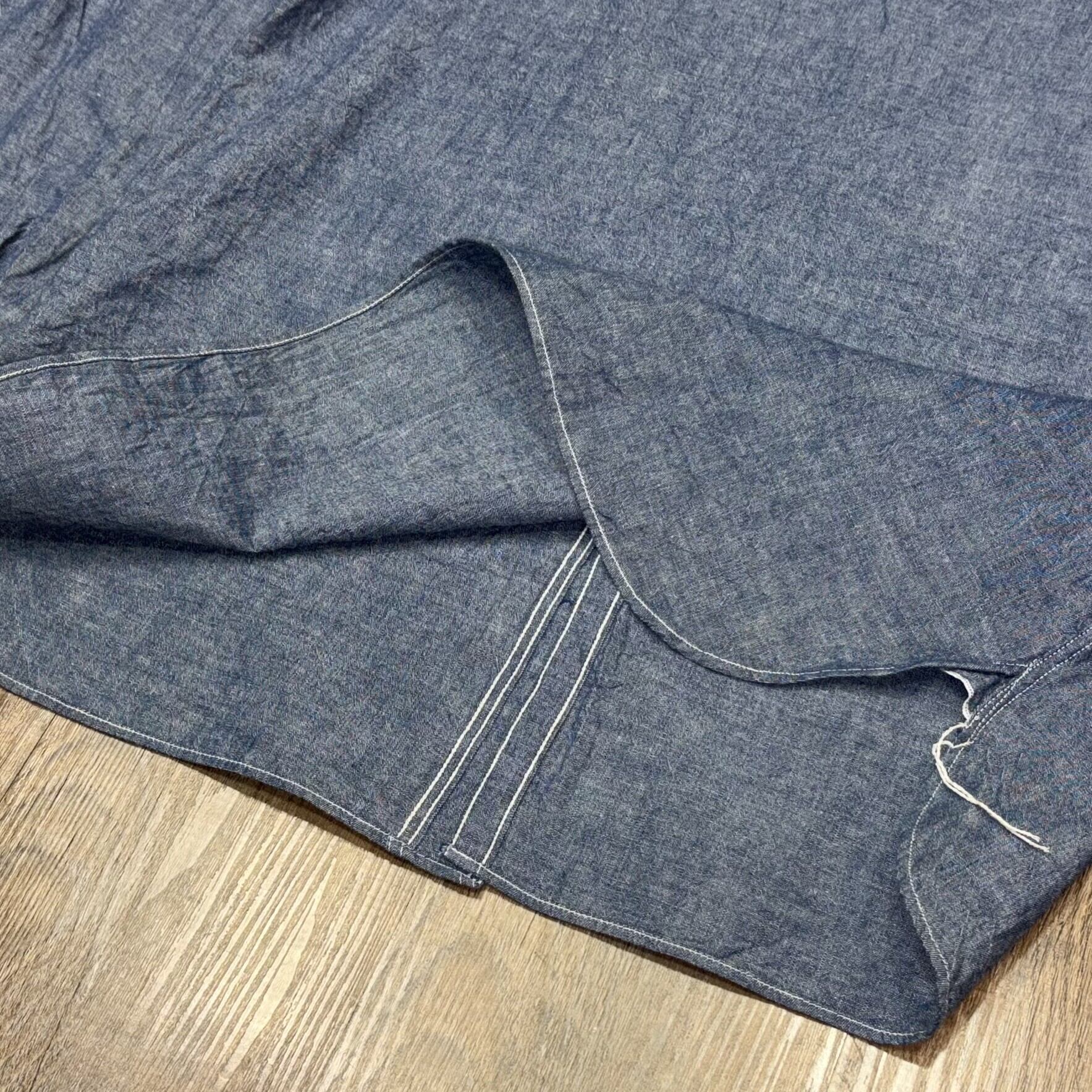 米海軍が採用したシャンブレーシャツは1930年代から現在まで支給が続く息の長いユーティリティーシャツである。このシャンブレーシャツは1950年代に採用したシャツのリプロダクション。時代の移り変わりと共に型や仕様に変化が見られたが、採用当初から1950年代に採用されたシャツは裾の両サイドはマチ付きが付き、台襟のある襟に前立てが付いた古き良き時代の仕様。この時代のシャンブレーの生地はテンションがあまく、洗濯を繰り返すことで縮みが生じて特有の風合いとなるのが特徴。