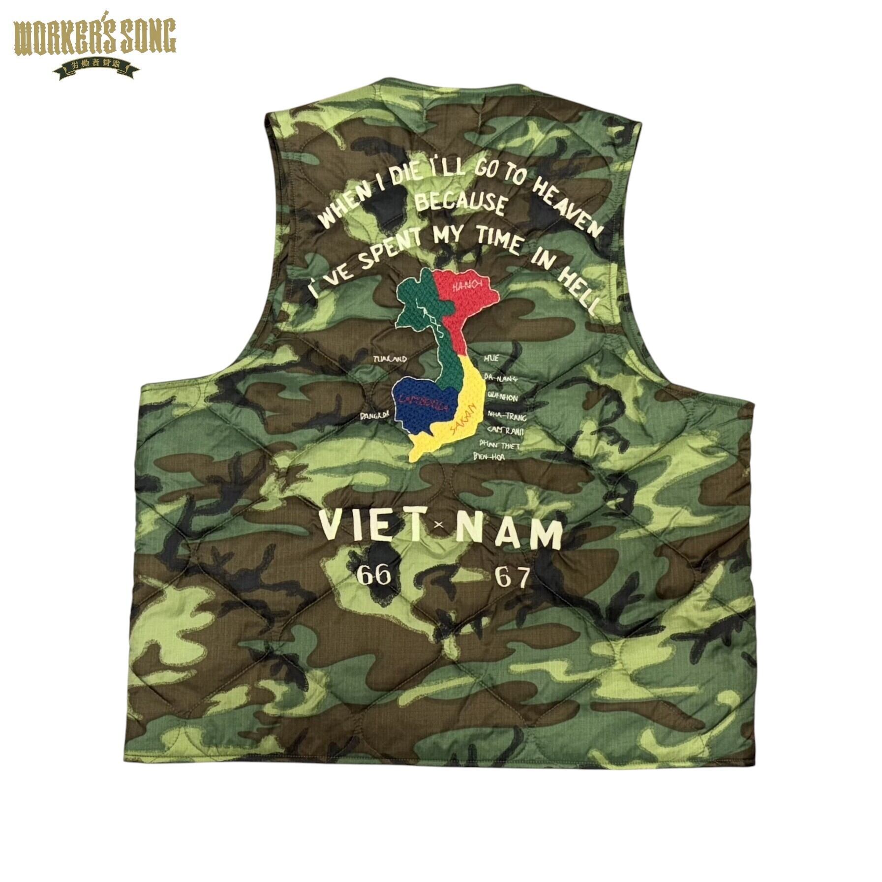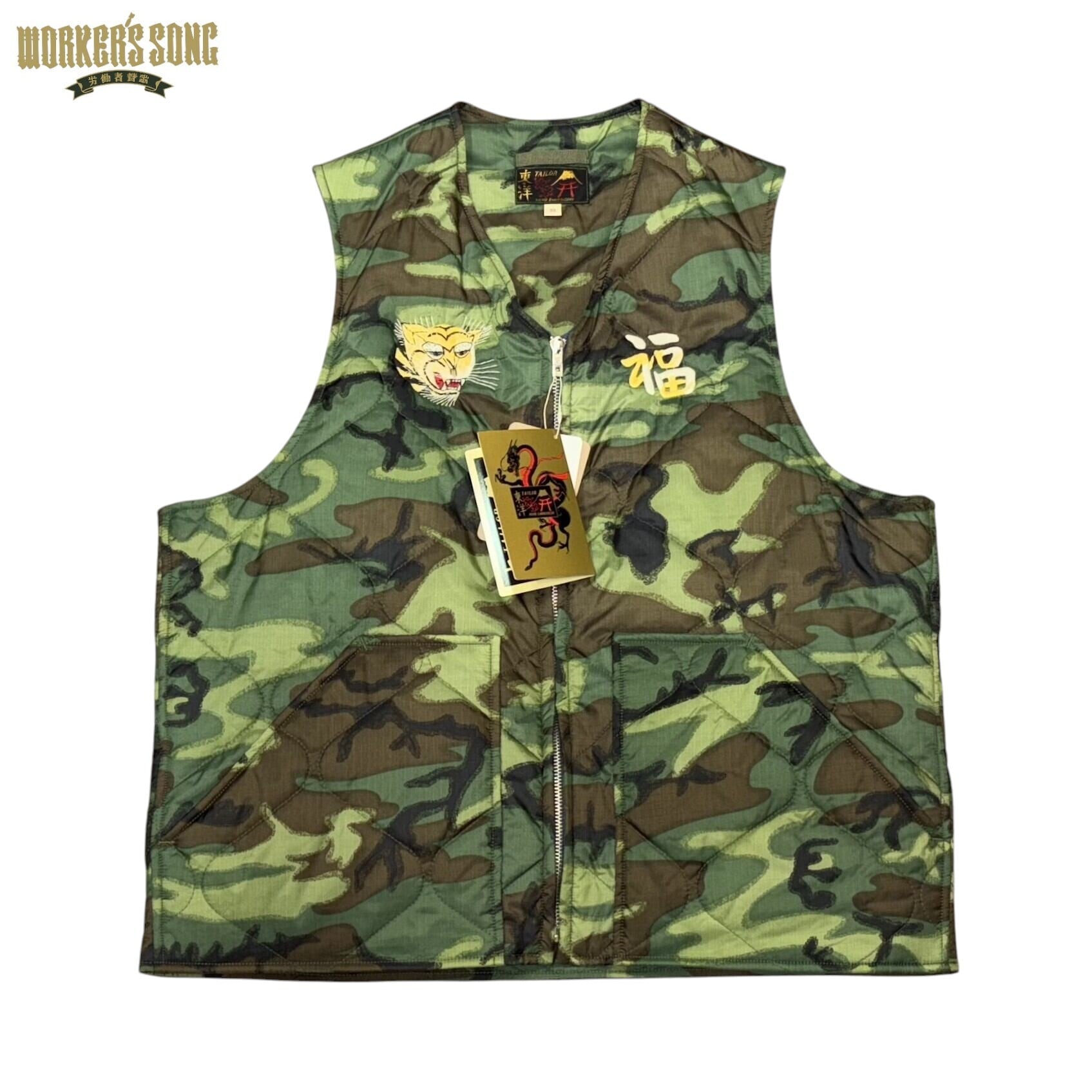 1966〜67年、ベトナムに駐留した米兵がアメリカへと持ち帰ったスーベニアベスト。ベトジャン同様、胸には虎と福の文字、背中にはベトナムマップの刺繍が入る。瓢箪型のキルティングステッチが入ったミリタリー由来のカモフラージュ柄ナイロン製リップストップ生地は、中綿入りのため適度な防寒性も備えている。またボタンではなくファスナー仕様となっており軽くて着やすい1着。