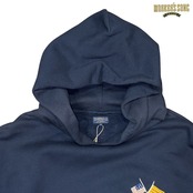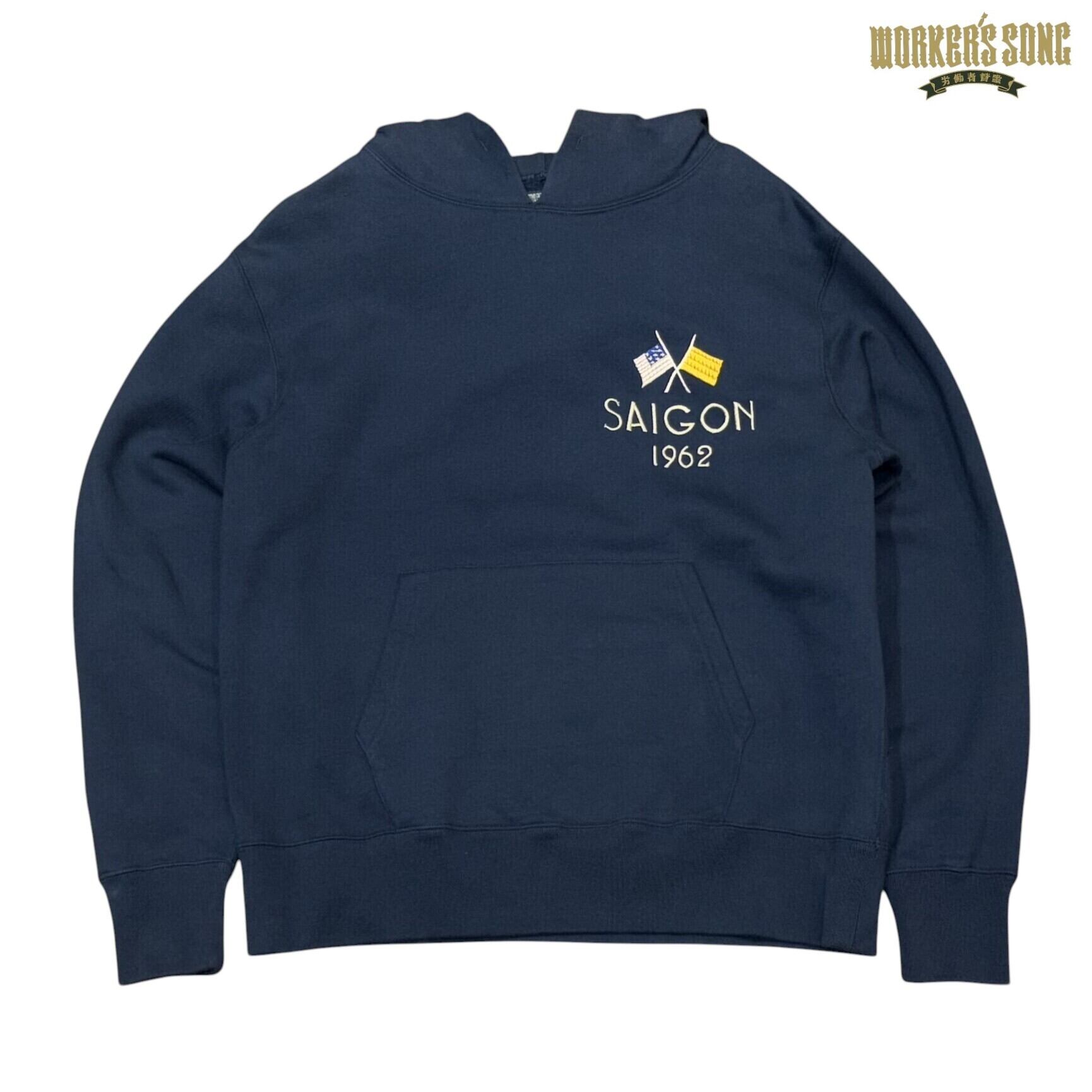 ベトジャンに描かれる柄をヘビーなクルースウェットパーカにアレンジしてリリース。左胸にはアメリカ国旗と今は亡きベトナム共和国(南ベトナム)の国旗、背中にはベトジャンでお馴染みの愛らしい表情の虎が刺繍されている。ポケットは裏起毛のスウェット生地を縫い付けたカンガルーポケットで、ハンドウォーマーとしての役割も兼ね揃えている。