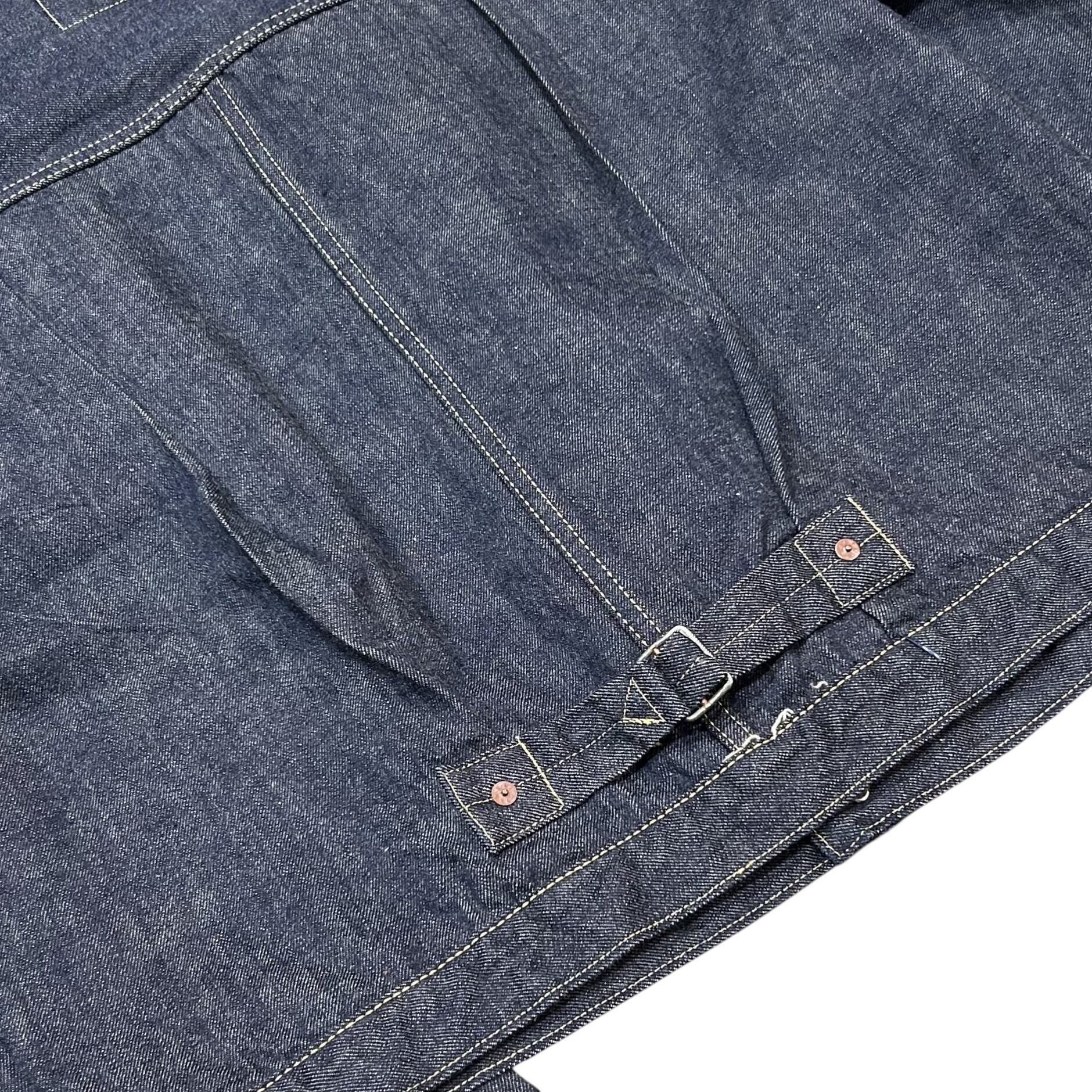 ベジタブルタンニングのディアスキンラベル。鉄製の唐草柄ドーナツボタン。左身頃のプリーツステッチは縫い始まりと終わりが上で、右身頃は下が縫い始まりと終わりになる。手作り感のあるポケットステッチ。見返し裏にはセルビッジが見える。運動性を与えるプリーツ。手作り感のあるステッチとリベット位置。地の目を縦使いしたカフス。横使いと表情が変わってくる。ざらつきのある13.6oz.のオリジナルデニム。