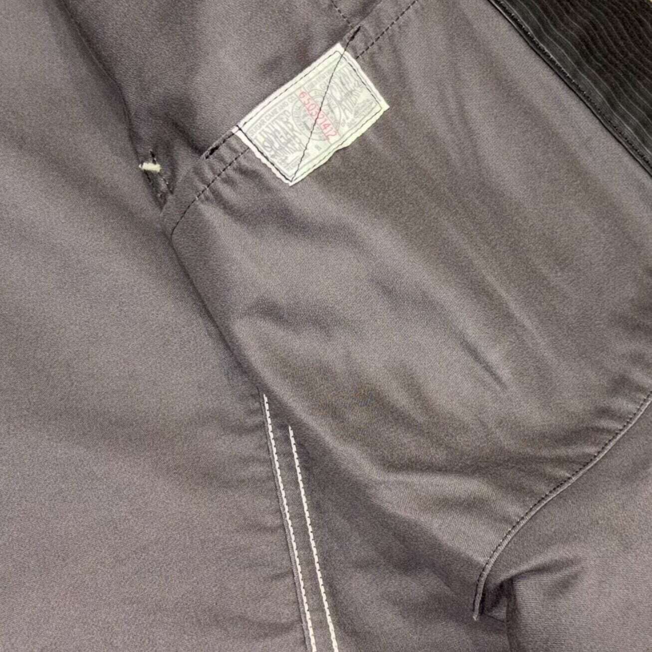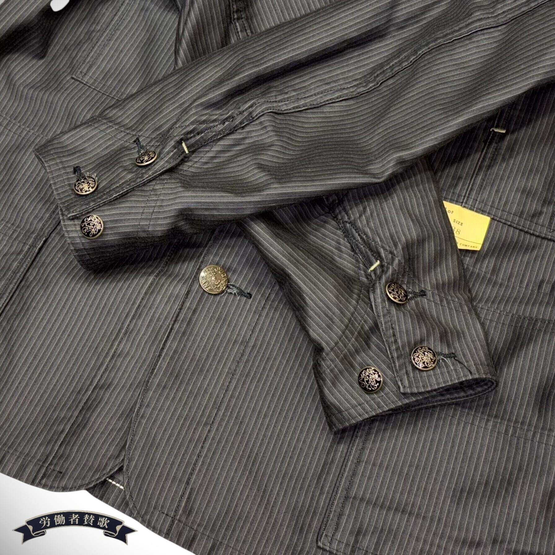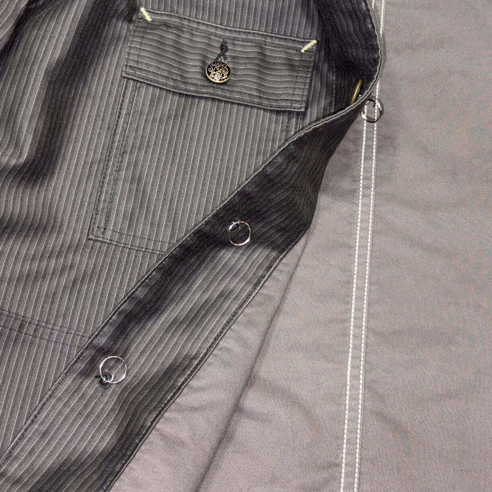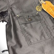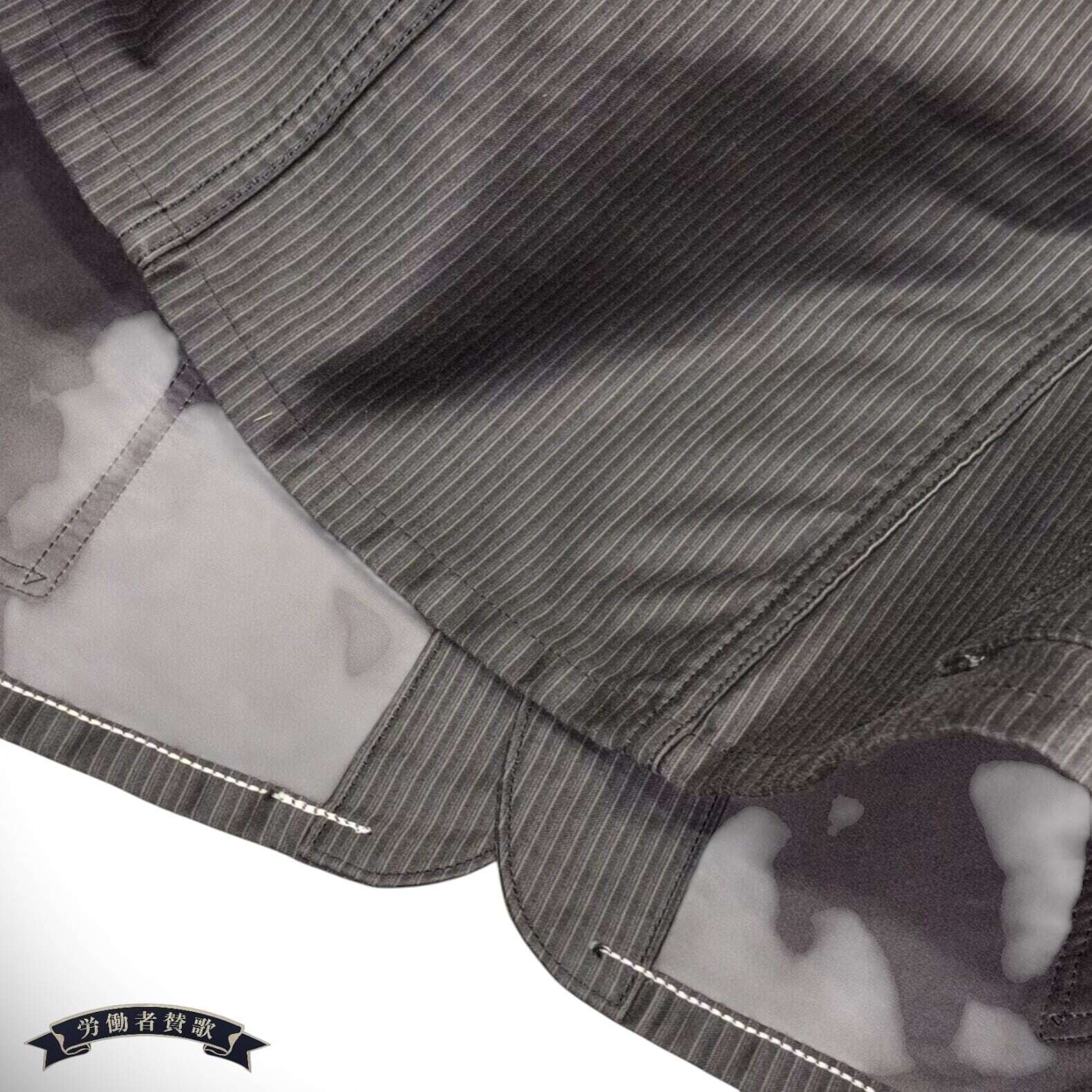 9.5オンスのモールスキン生地を使用したワークコート。一見、織柄に見えるこちらの生地は、実はプリントでストライプを表現したものでヴィンテージでは非常に珍しい。1930〜40年代のデッドストックのワークパンツに使用されていた生地をサンプリングして作製しており、フレンチワークウェアではお馴染みのモールスキンの下地をグレーに染め、ストライプをブラックでプリントしている。型のベースとなっているのは1930年代にヘッドライト社が手掛けたワークコート。