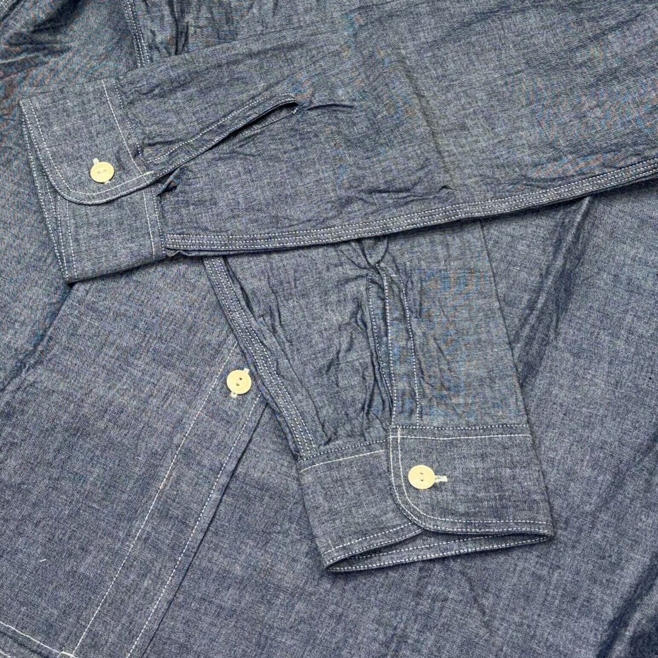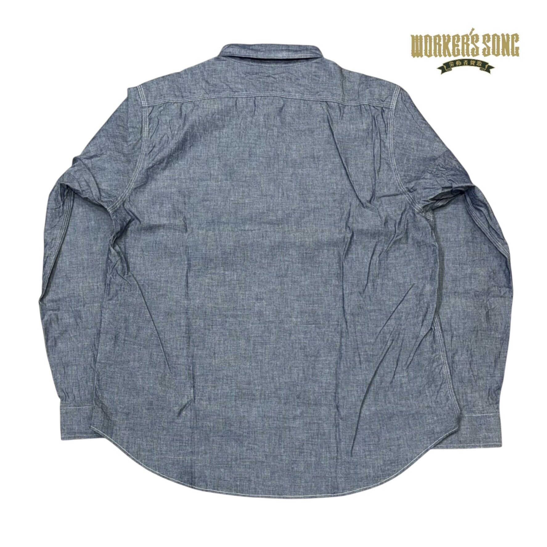 1950年代のシャンブレーシャツがベース。ワークウエアらしい3本針巻き縫い仕様のタフな作り。経糸にインディゴ糸、緯糸を白糸で織り上げたブルーシャンブレー生地を使用している。同型でショートスリーブモデルも展開。