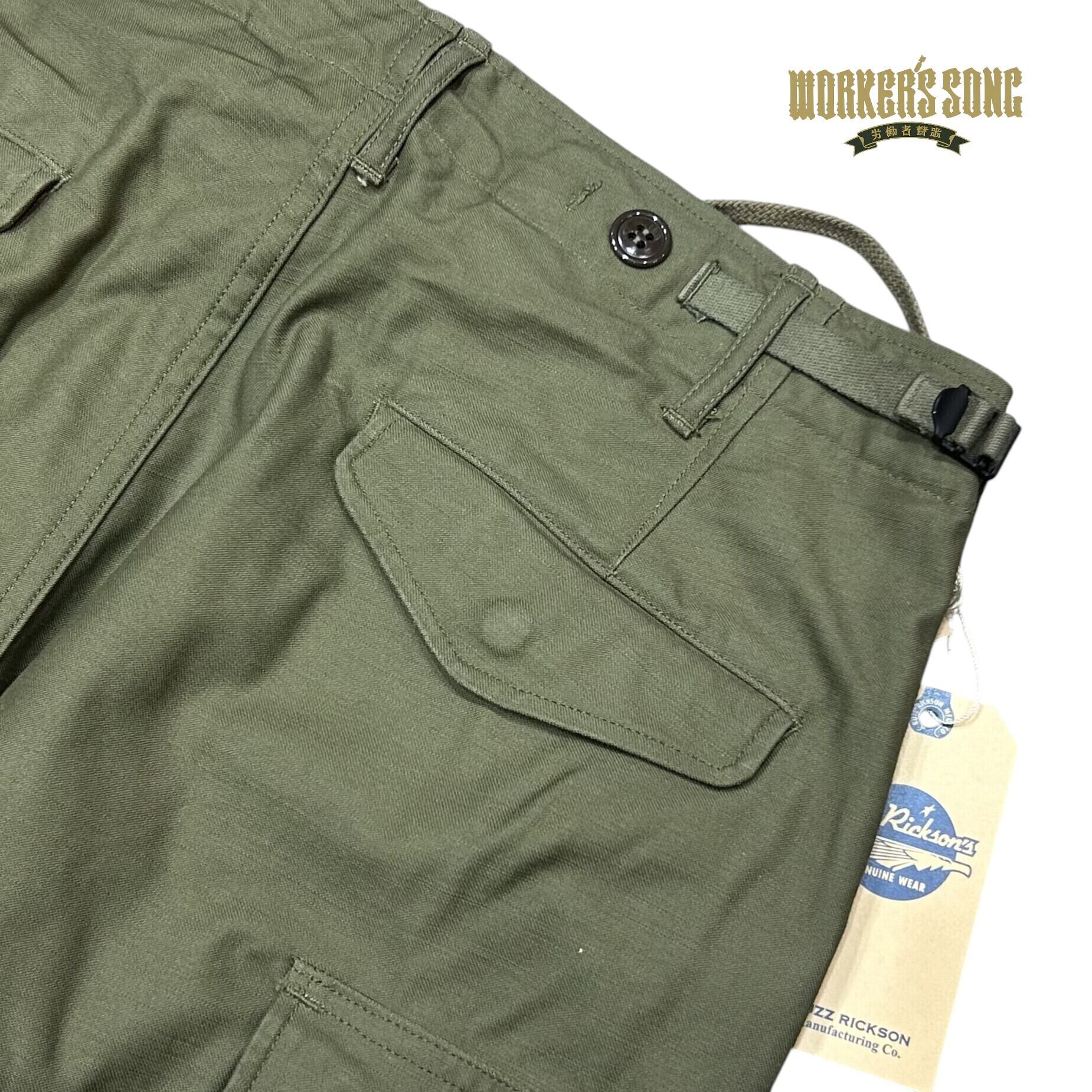 米陸軍が1951年に採用したコットンサテン地を裏使いしたフィールドトラウザース。陸軍はこの頃、寒冷地用の戦闘服としてM-51シリーズのセットアップレイヤードシステムを採用した。アンダーシャツ、ドラウァー(ズボン下)を履いた上にウール製のフィールドシャツとフィールドトラウザースを着用し、更にその上からコットン製のフィールドジャケットとフィールドパンツを着用した。いずれのM-51も寒冷地での着用を考慮し、ルーズフィットにすることで体温を閉じ込め、外気を遮断する効果を重視している。ウエスト内側に設けられたコードループは、サスペンダーの先端に付いた金属製のフックを引っ掛けるためのディテールである。